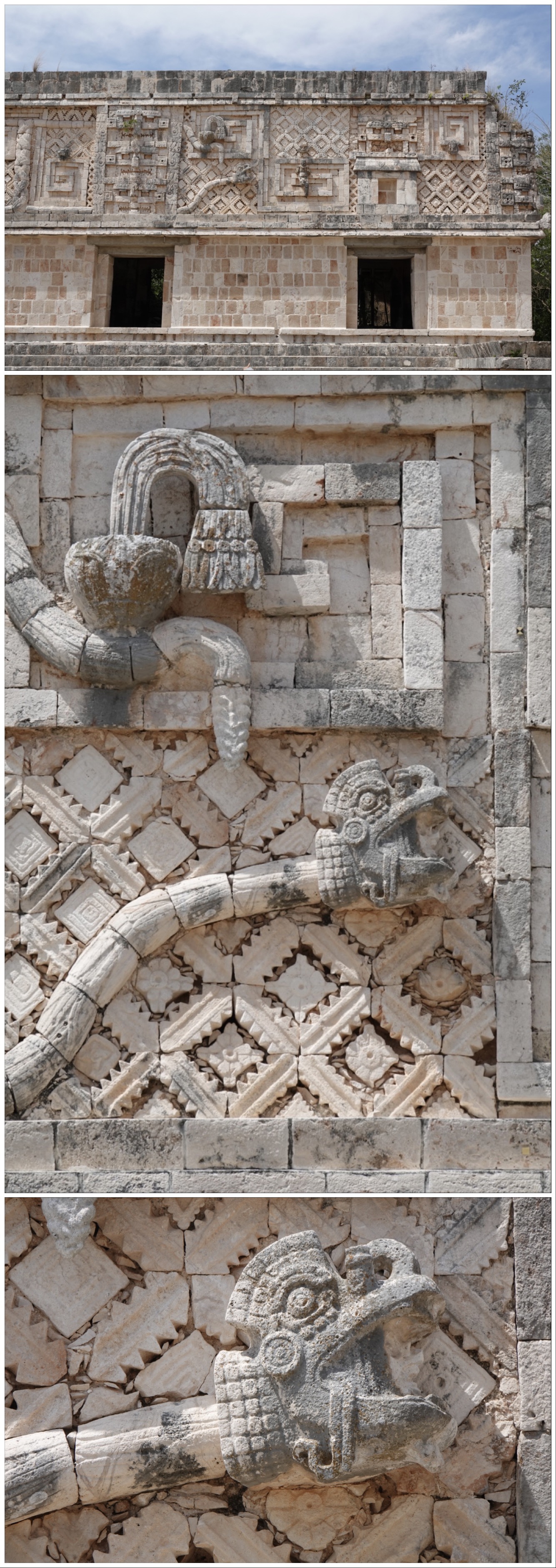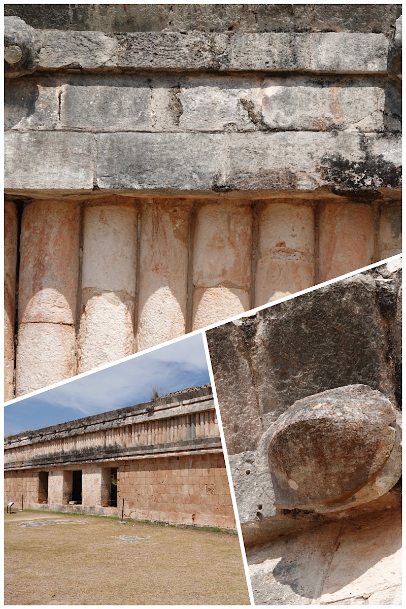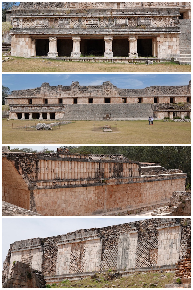 The buildings are typical of the Puuc style, with smooth low walls topped by ornate stone friezes depicting typical Maya huts. The columns represent the reeds used for the walls of the huts and trapezoidal shapes representing the thatched roofs.