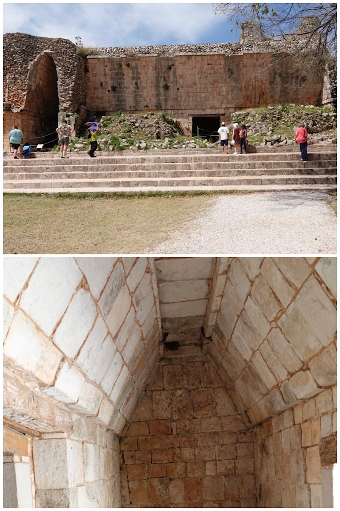 Our final challenge was climbing up to the Governor’s Palace, a long low building atop a huge platform, which is actually on top of another temple. The Governor’s Palace boasts the longest façade of any building so far discovered in Pre-Columbian America. The palace itself covers an area of more than 1,200 m2 (12,917 sq ft). The stairs reaching the palace are fairly steep, have tall risers, and shallow surfaces that necessitate going up walking almost sideways, and following a serpentine route. At San Gervasio we were told that the shallow steps at the temples were built that way on purpose to ensure that neither a person’s front nor their back directly faced the entrance in a disrespectful manner. Our guide did not know if that was also the case here.