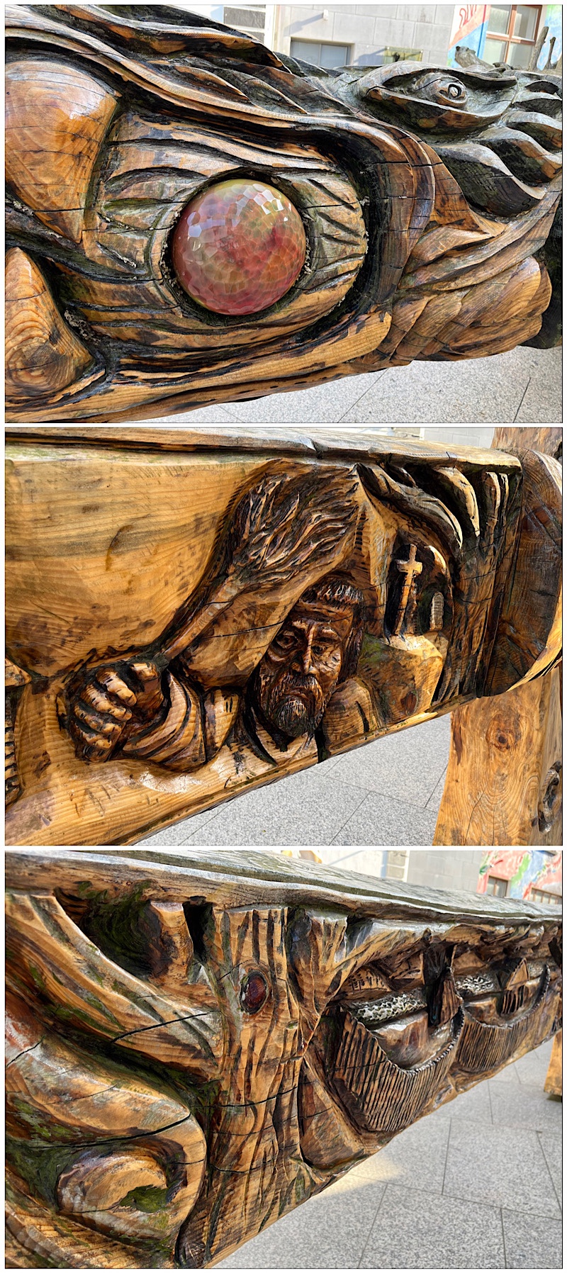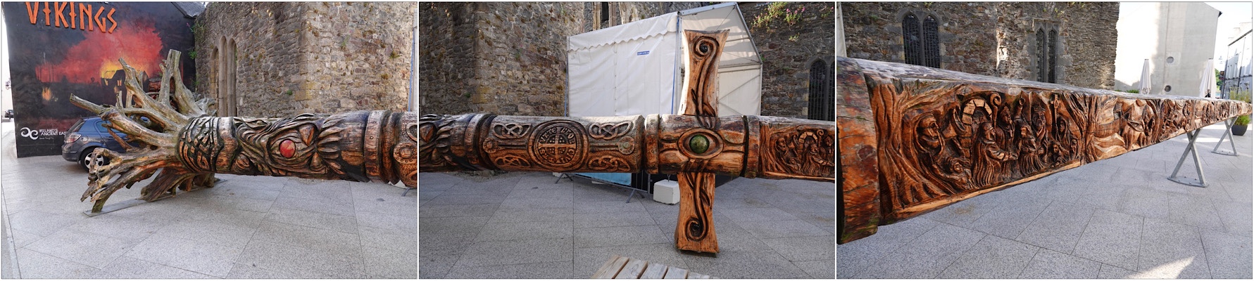 In the “Viking Triangle” in the centre of town we were wowed by the Dragon Slayer Sword, carved from a tree trunk over 20 feet long. The sign on the wall of the Viking Triangle courtyard explained that The roots represent the fiery tail of a comet that morphs into a dragon grasping the pommel of the sword. Vikings believed that comets were caused by dragons hurling bolts of fire across the sky, while those fearing attacks by Vikings saw comets as bad omens.