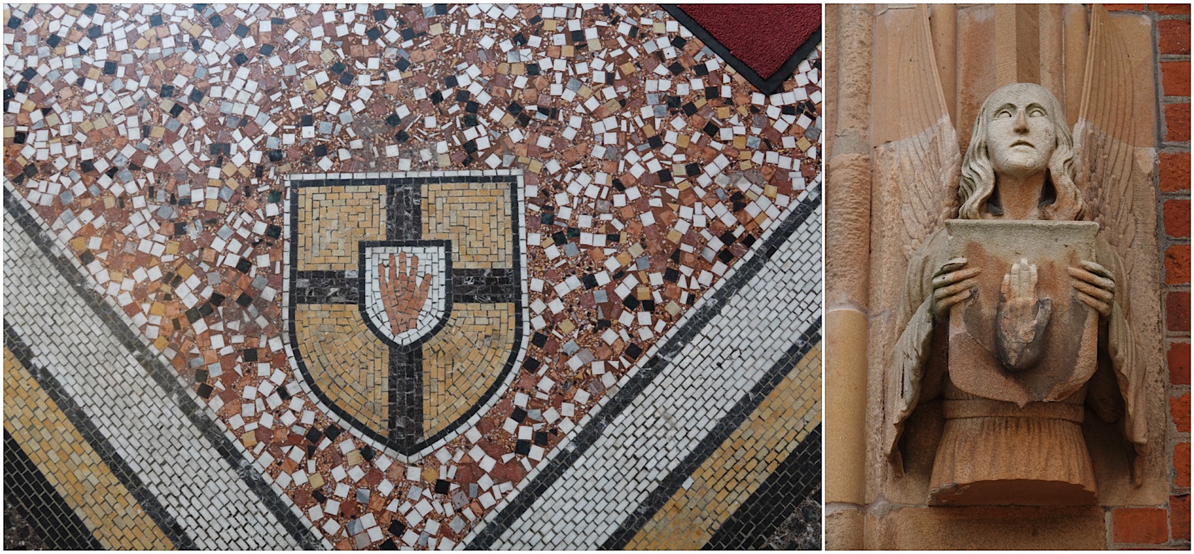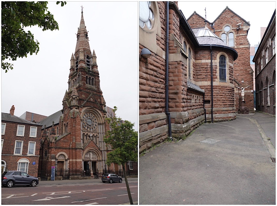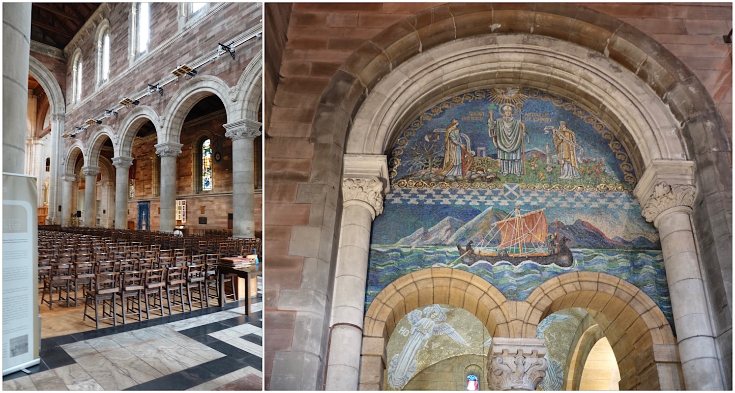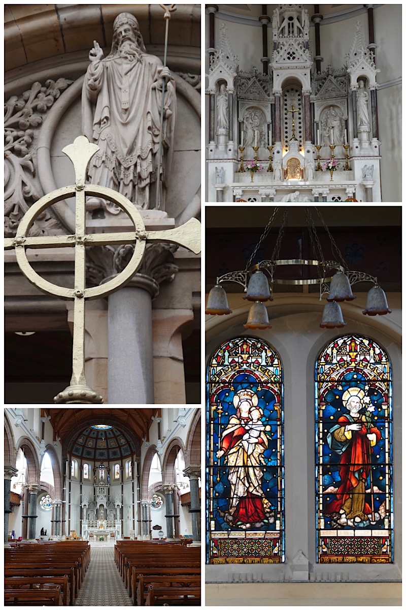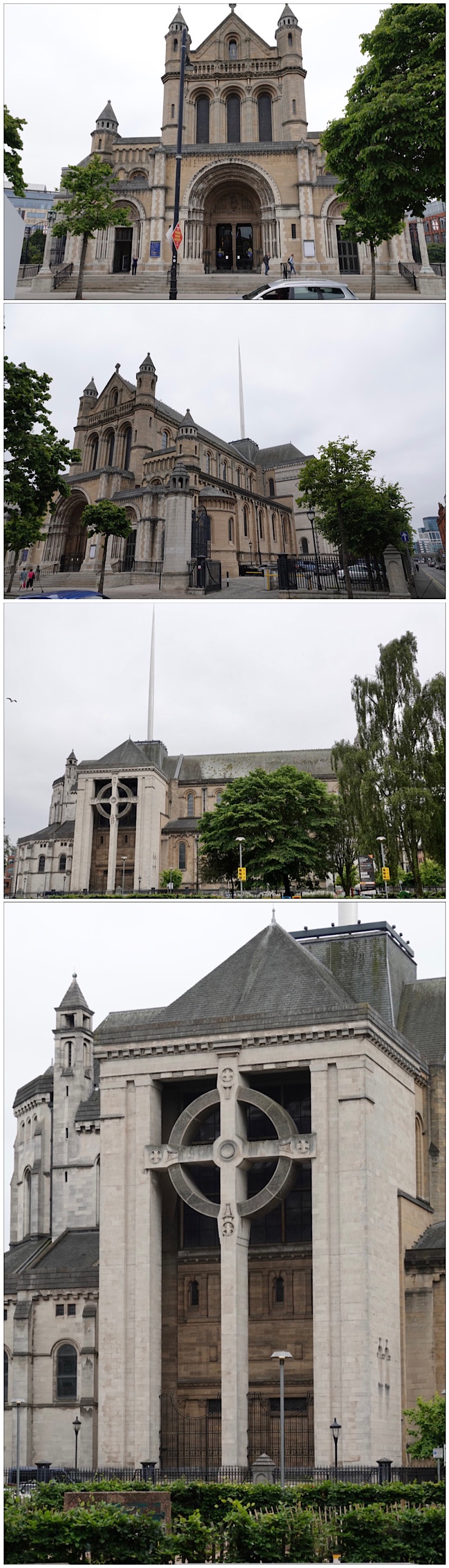 We stopped for lager and chips (french fries) at one of Belfast’s pubs, where we chatted with a couple from Australia travelling through Ireland before heading to Scotland, England, and Croatia, snd then walked to St. Anne’s impressive Belfast Cathedral. Unfortunately we were too late to tour the inside, so Ted got only a couple of interior photos of its Romanesque columns, and then its impressive exterior and huge Celtic cross from across the street where we could also see its tall thin modern spire.