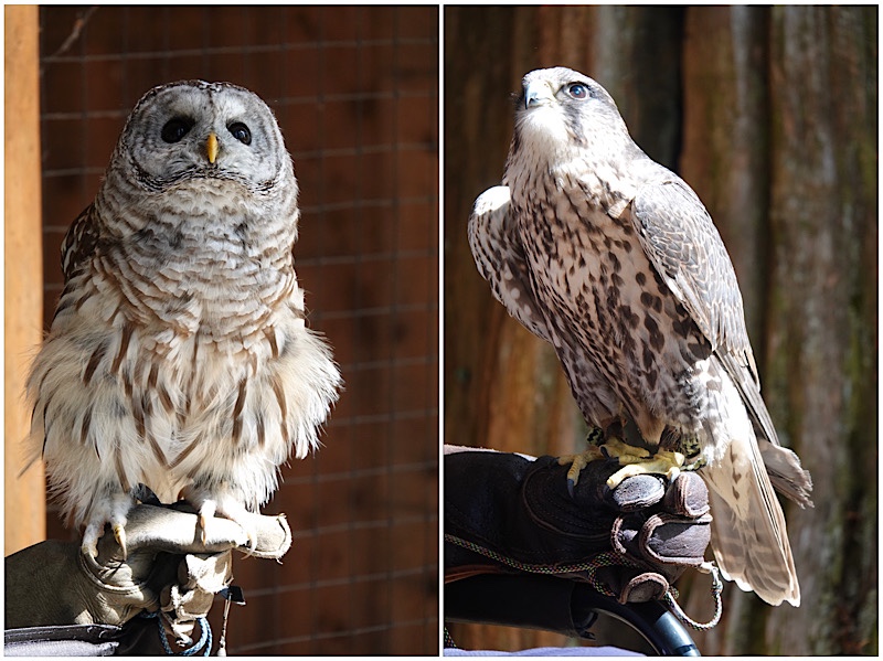 Having made it across the bridge, our first stop was at the raptor centre, where the handlers had Chico the barred owl and Geraldo the gyr falcon out visiting. Geraldo was born in captivity and worked for 17 years controlling unwanted bird populations in places like airports. He is now “retired”, and will likely spend his next 10 or so years of life in leisure showing tourists how handsome he is.