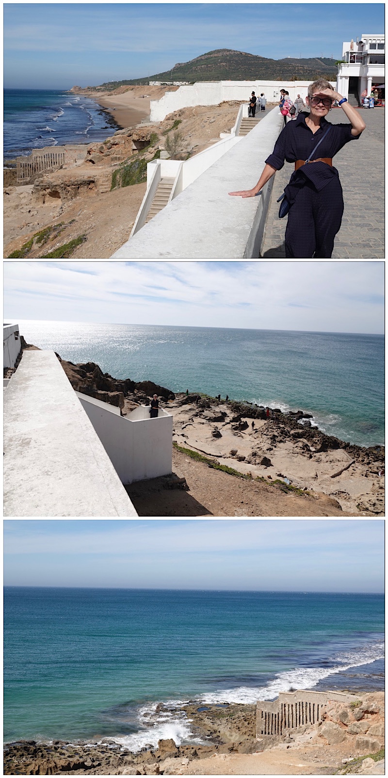 After exploring the cave, we drove a short distance to stop at Cap Spartel, the point at which the Atlantic and Mediterranean meet. Early in the morning, the delineation of the 2 waters can be seen as a border between blue and green, but mid-afternoon in full sun that was not visible.