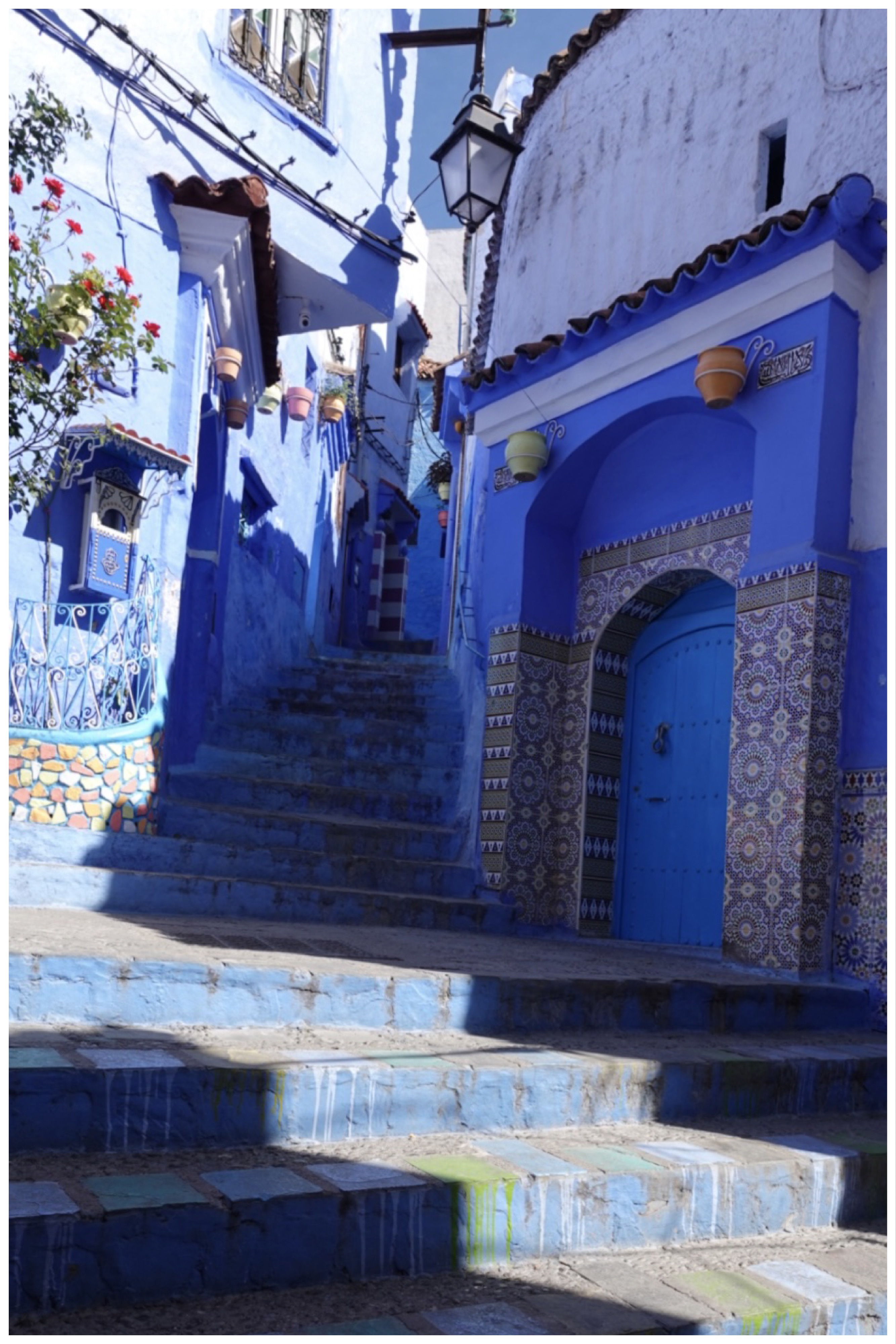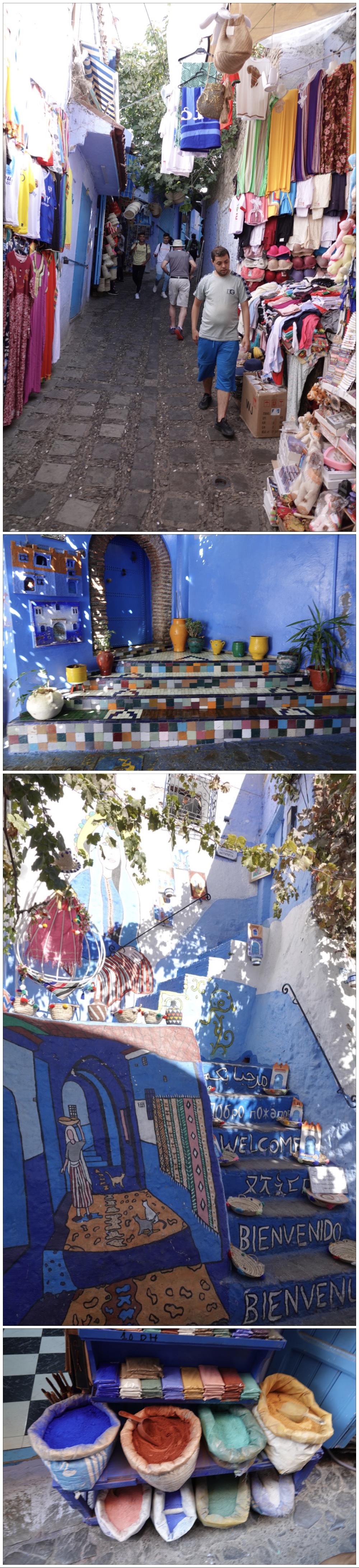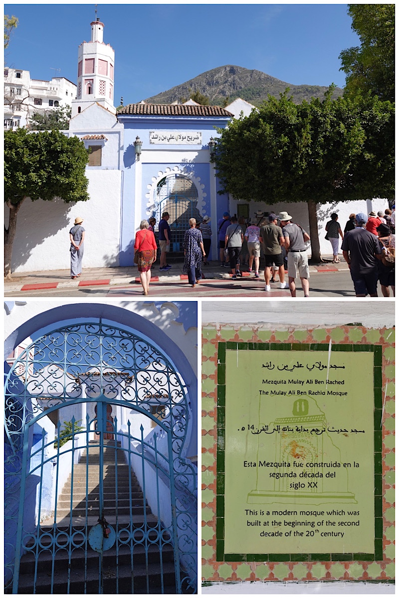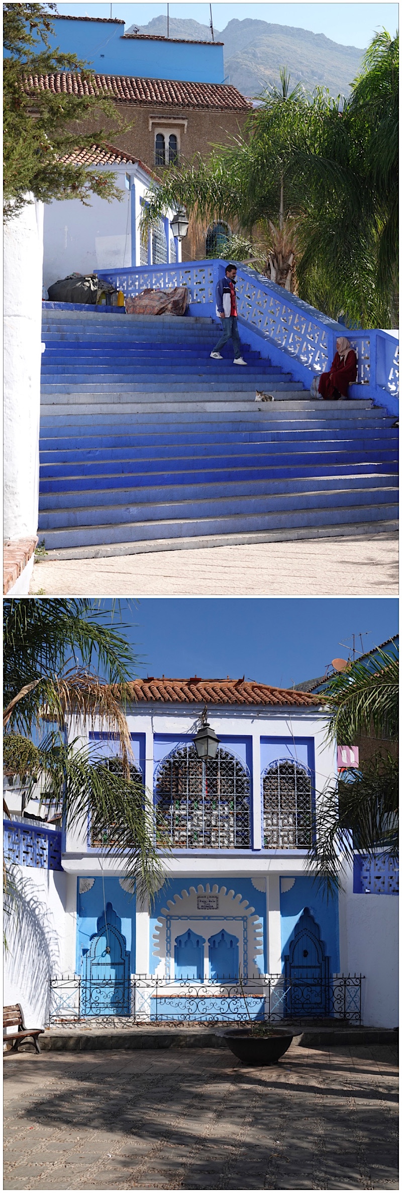 On to our main goal. Chefchaouen truly is a blue city, especially in the old kasbah/medina. Shops, homes, small hotels and restaurants, mosques, and even entire street surfaces are painted in various shades of blue. The colour dates back to settlement of the area by Jews displaced from Spain during both the Crusades and the Spanish Inquisition, and is most often the same blue shade as the Israeli flag, representing sky and heaven. By contrast, green is the colour most often used by Muslims, signifying peace – but in Chefchaouen even the mosque outside the kasbah is blue!