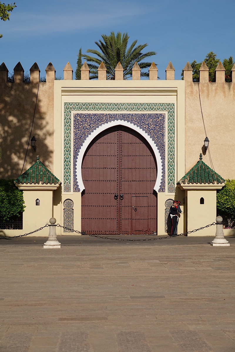 The palace entrances. Workers were busy polishing the brass with lemons to make it gleam. The writing to the right of the main doors extols the virtues of the late King Hassan II. The blank wall to the left of the doors will eventually praise the actions of the present King Mohammed VI.