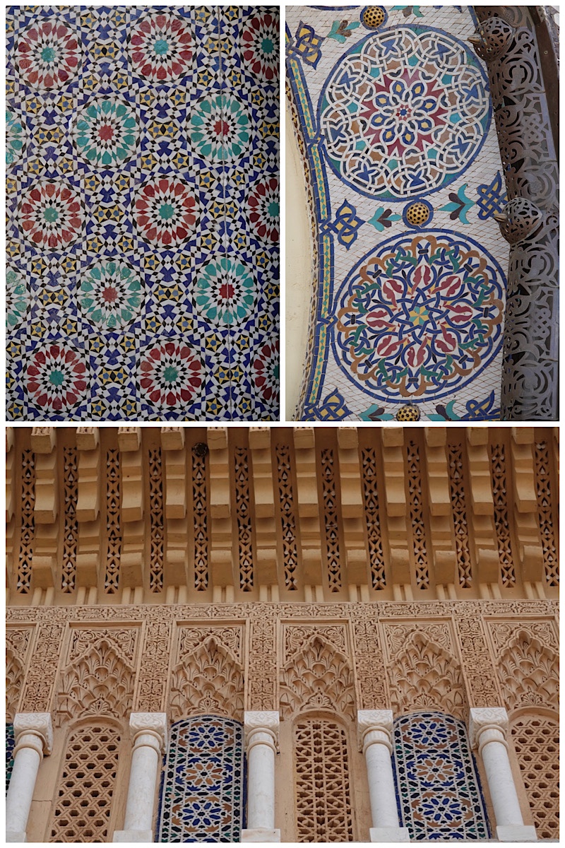 Top: Zellige, the tiny cut ceramic mosaics that decorate the palace, and which we will see made later in our tour. Bottom: ornately carved cedar. We learned that cedar is waterproof, durable, repels insects, and is great insulation, which is why it is almost exclusively the wood used in Moroccan buildings.