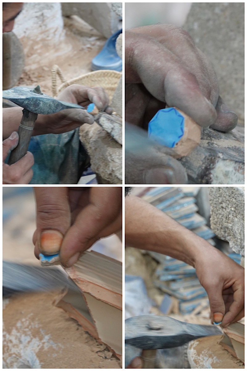 Top: two tile cutters work together to chisel tiny shapes out of the glazed squares. Depending upon the designer’s vision, they may cut hundreds of blue stars, or red diamonds, or whatever else is needed. Bottom left: Working from the BACK of the piece (i.e.the colours are face down) the tiny tiles are laid into the specific pattern. Then the spaces between the tiles are filled with a grout that needs 2 days to dry before a layer of fibreglass is painted over to hold the entire thing together. Fibreglass is a modern material used to make items both lighter and more durable for shipping internationally. Bottom right: a completed mosaic fountain.