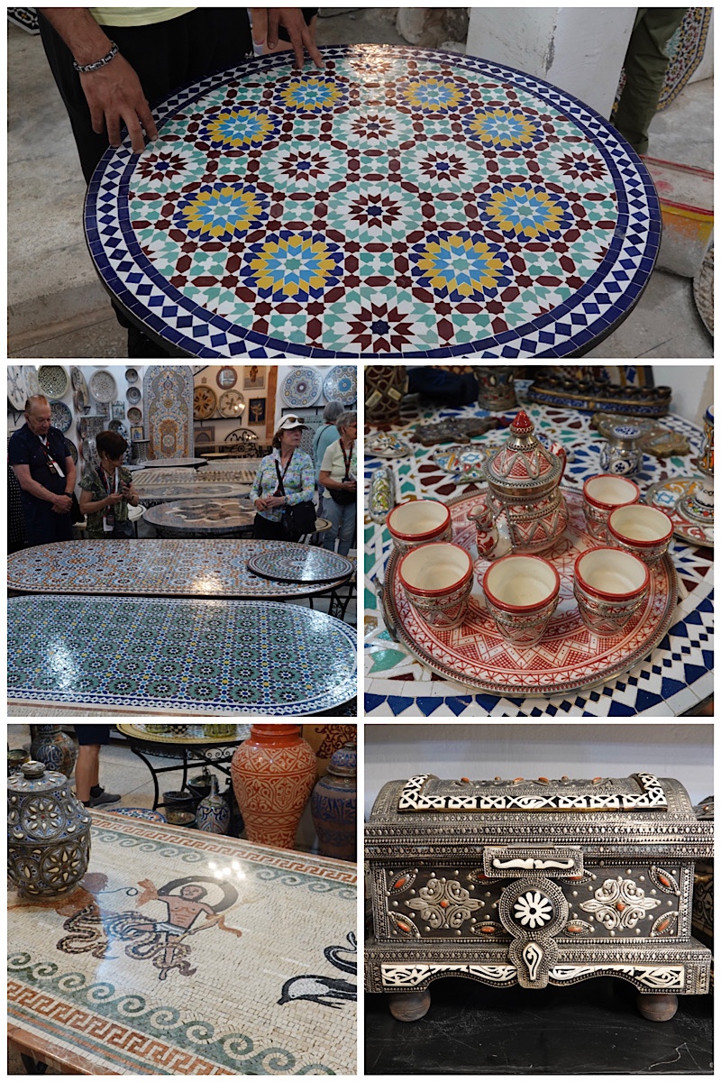 Some of the gorgeous items made with zellige, including tabletops, silver-adorned tea sets, a table that looks like a floor from Volubilis, and a curio box.