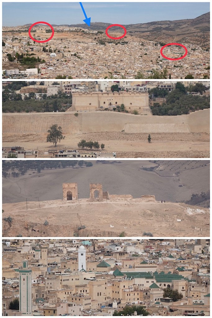Top: the arrow points to our hotel. The 3 circles from L to R are the Borj Nord (north fort), the ruins of the 14th century Marinid Dynasty necropolis, and the University of al-Qarawiyyin. The next 3 pictures from top to bottom are zoomed in on those 3 circled landmarks.