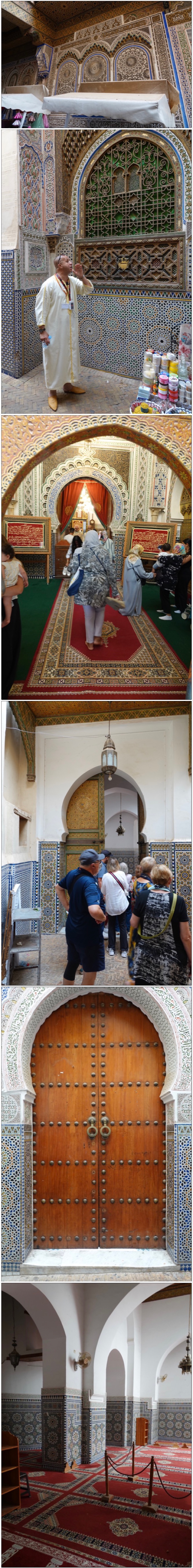 Next we walked through the Jewish Quarter (the “Mellah”) in the Fes Jdid. When the Jewish population was welcomed into Fes in the 9th to 11th centuries, partly to help establish a better economy and partly to,provide a safe haven after their expulsion from Spain, they were housed as a community. Today, Fes’ Jewish residents live in the Nouveau Ville integrated with their Muslim neighbours, and the historic Jewish Quarter houses, in some state of current disrepair, only Muslims.