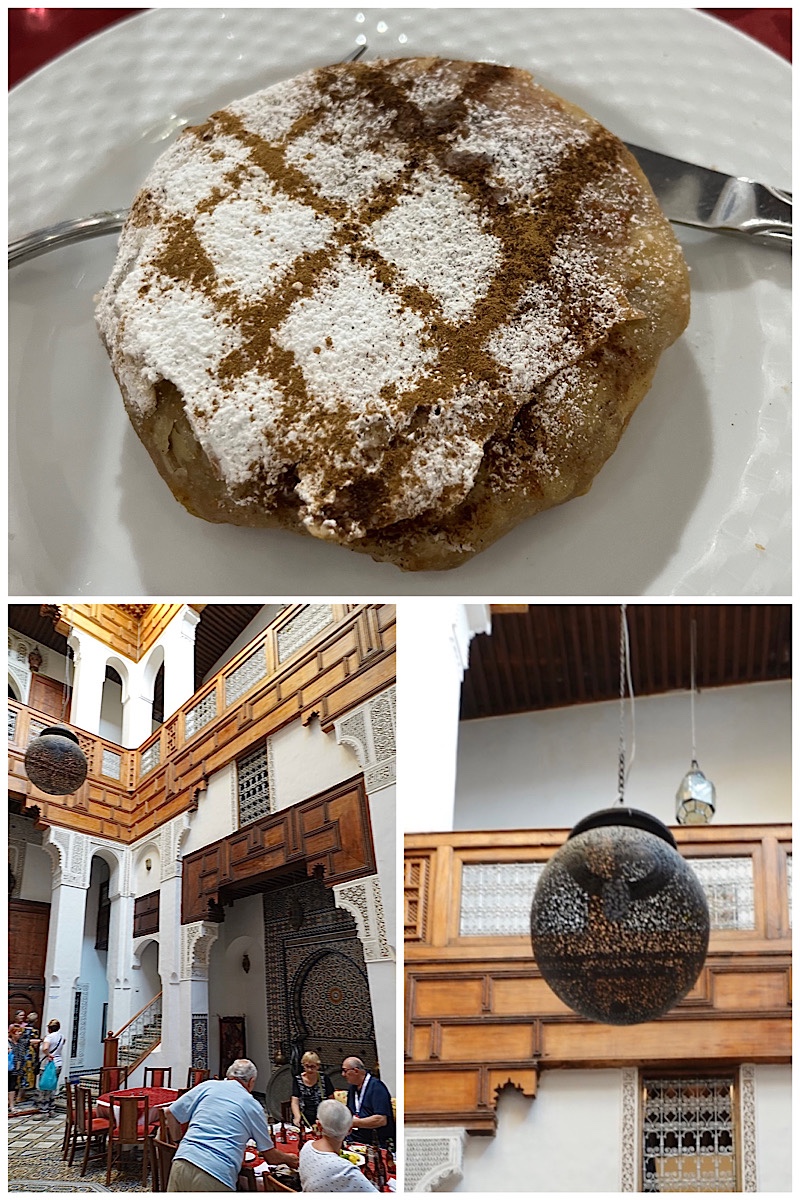 Top: our entrée, a Moroccan pastilla, a crispy flaky phyllo-like pastry filled with spiced shredded chicken and vegetables and dusted with cinnamon and sugar.