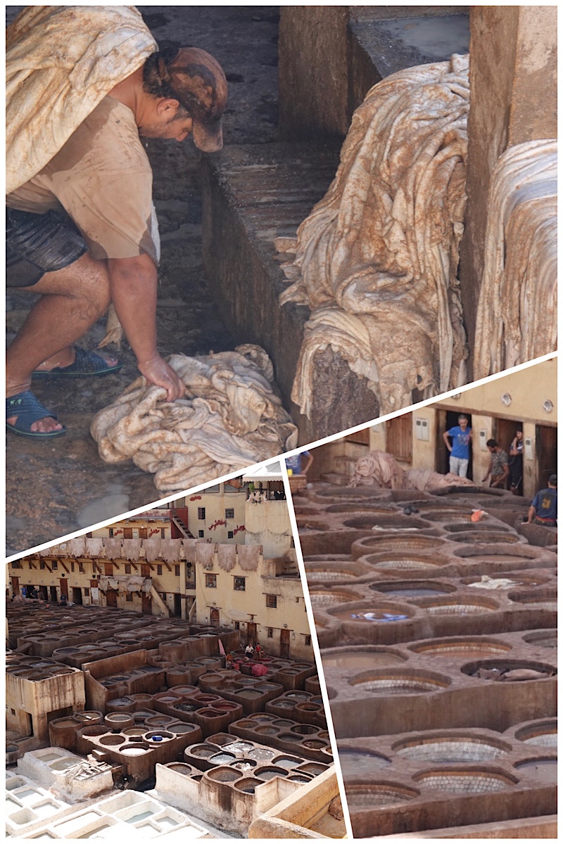 Heading into the tannery we were each given a large sprig of mint to help offset the smell of tanning hides. While this tannery does not use urine to soften hides the way many do, their substitution of acidic pigeon guano is not much less olfactorally pungent.