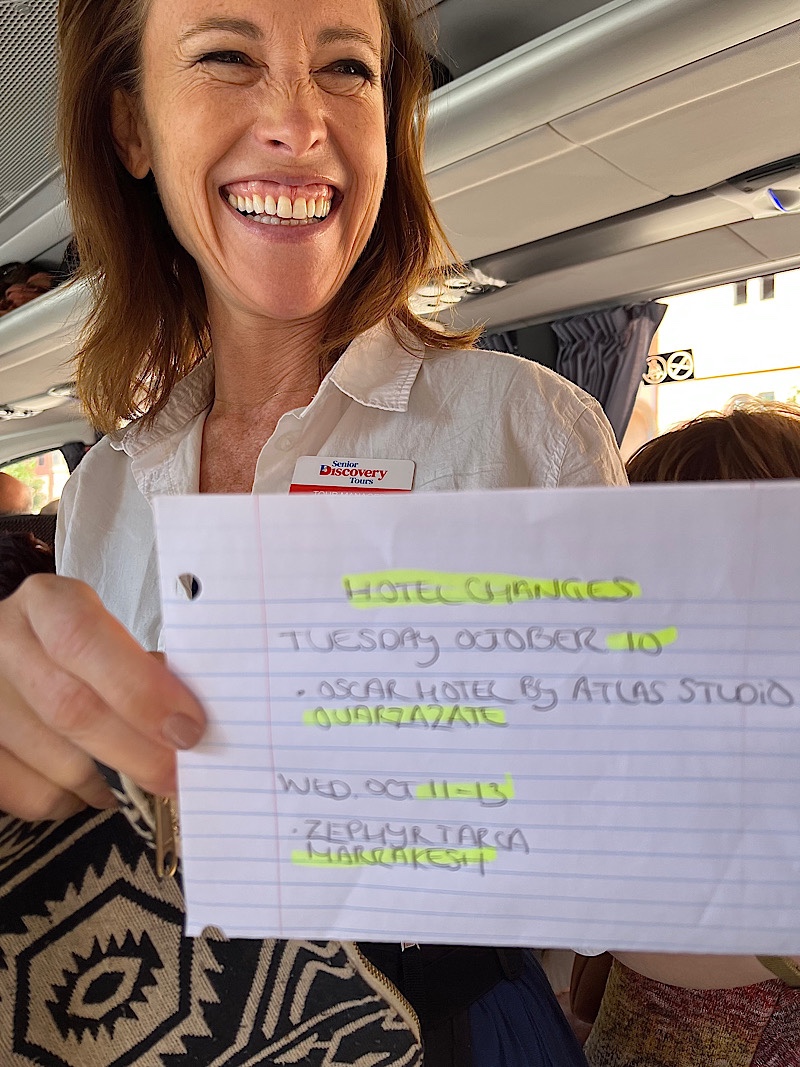Our 3 night Marrakech hotel is also changing because of the IMF (International Monetary Fund) meeting in the city. That should definitely not have been a surprise given how far ahead those conferences are scheduled. In compensation SD will provide each of us with 2 free lunches and a dinner with a folkloric show “fantasia”.