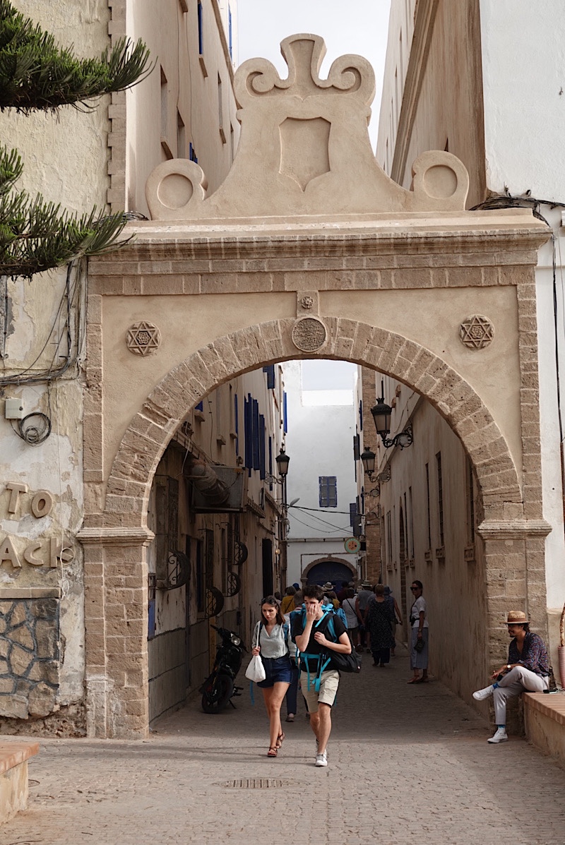 From the fishing port we entered the medina through Bab-el-Marsa, the gate of “La Marine”, or Navy Gate. The date inscribed on the gate is 1184, which is 1769 in our Gregorian calendar. All 3 monotheistic religions are represented on the gate, indicating a welcome to traders from everywhere.