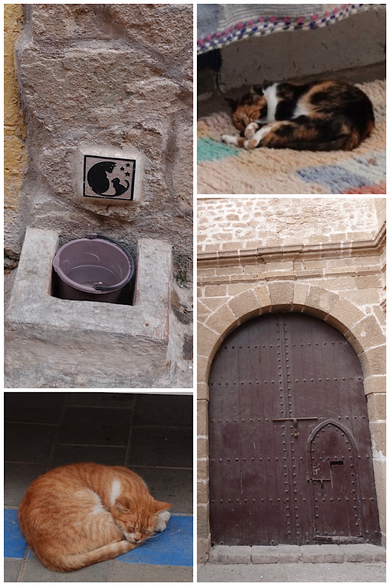 We’ve been seeing a LOT of street cats in Morocco, but those in Essouaira were certainly the healthiest looking. Our guide told us that reason there are so many cats in the Medina dates back to the time that was a trading centre that needed cats to eliminate mice and rats, and prevent plague. Cats wandering the medina now are too well-fed to be much interested in rodents other than as playthings. He also told us that the cats that have a clipped ear have been spayed or neutered.