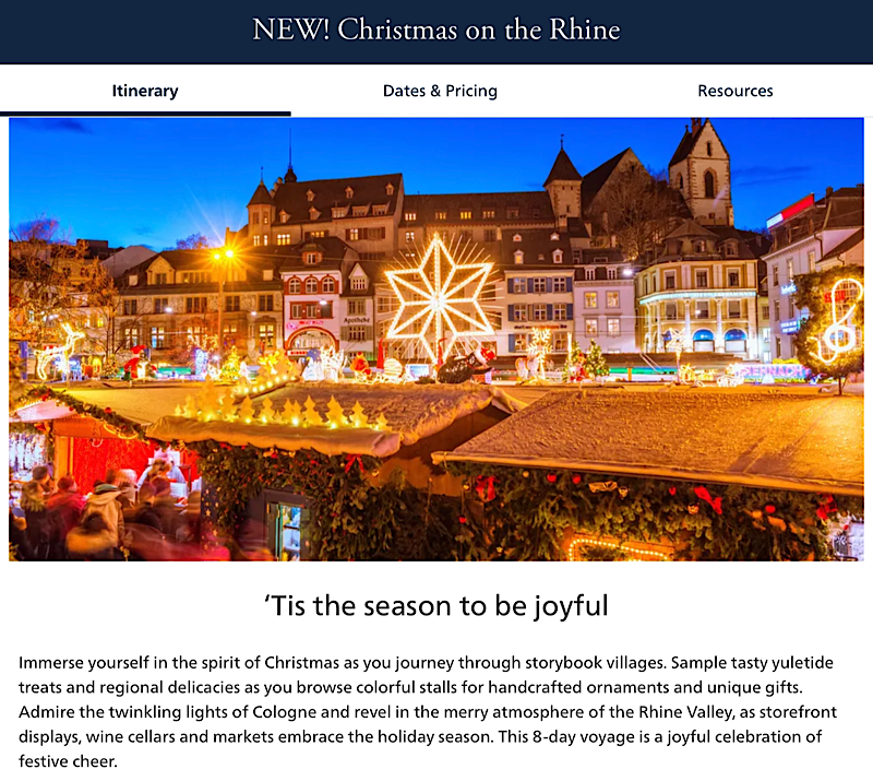 Our “replacement” trip is much less ambitious. We’ll be taking Viking’s Christmas on the Rhine river cruise, beginning in Basel Switzerland and ending in Amsterdam. We’ll visit 8 Christmas Markets over 7 days. That leaves the markets in cities on the Elbe, Danube, Mosel, Main, and in the many northern cities not on a river, to do some other year. (Sorry, Ted, but you know I’m ALWAYS planning – and Dresden is high on my wish list.)
