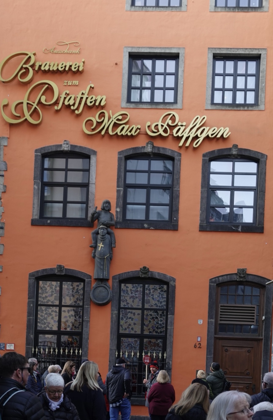 German surnames have meanings (like “Herrmann”) – the family name attached to this brewery is Päffgen, which in the local dialect is “son of the priest” (think about it). Rather than being an embarrassment, it’s been turned into a badge of honour, and the brewery’s wall proudly depicts a priest carrying his son on his back, while his son holds two typical Kölsch beer glasses.