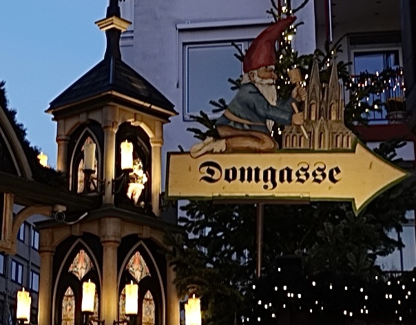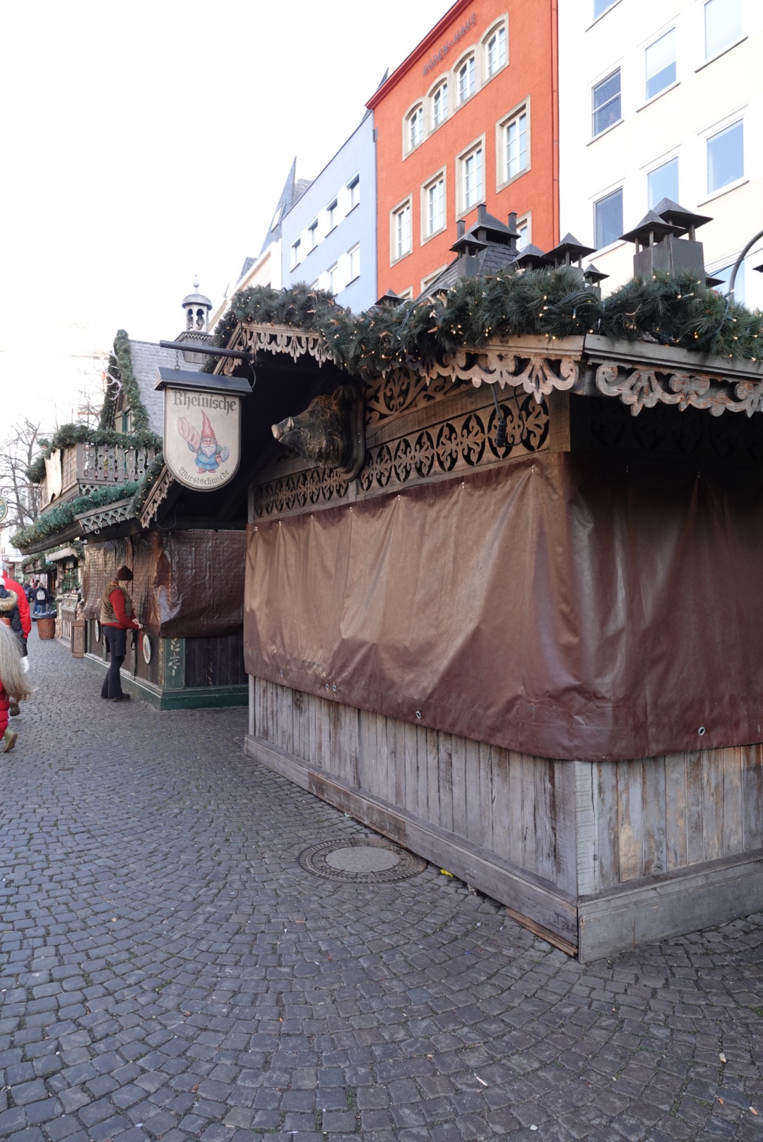 We walked very quickly along the Heumarkt (hay market) area, which hosts the market themed Heinzels Wintermärchen (Heinzel’s winter fairytale). A Heinzelmann, abbreviated to just Heinzel, is a mythical Köln elf/gnome/dwarf that figures prominently in the legends of the city. Mid-morning the booths were still shuttered and there were none of the crowds we’d see in a couple of hours.