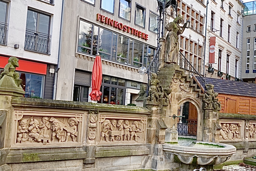 Apparently in the not-so-distant past, people in Cologne had nothing to do but drink and party all night and sleep all day. All their unfinished chores were magically done overnight by elves (Heinzelmänner) living under the houses. A certain Frau Schneider, not content with her good fortune, threw peas on her cellar steps in an attempt to trip up the elusive elves and see who was living in her cellar. Her strategy worked: the dwarves slipped on her stairs, were hurt, and she actually saw them! Unfortunately, her trick backfired by making the elves so angry that they left Köln en masse, leaving people who had become quite lazy to do their own work. Oliver says some Kölners are still just sitting around waiting for the dwarves to return.