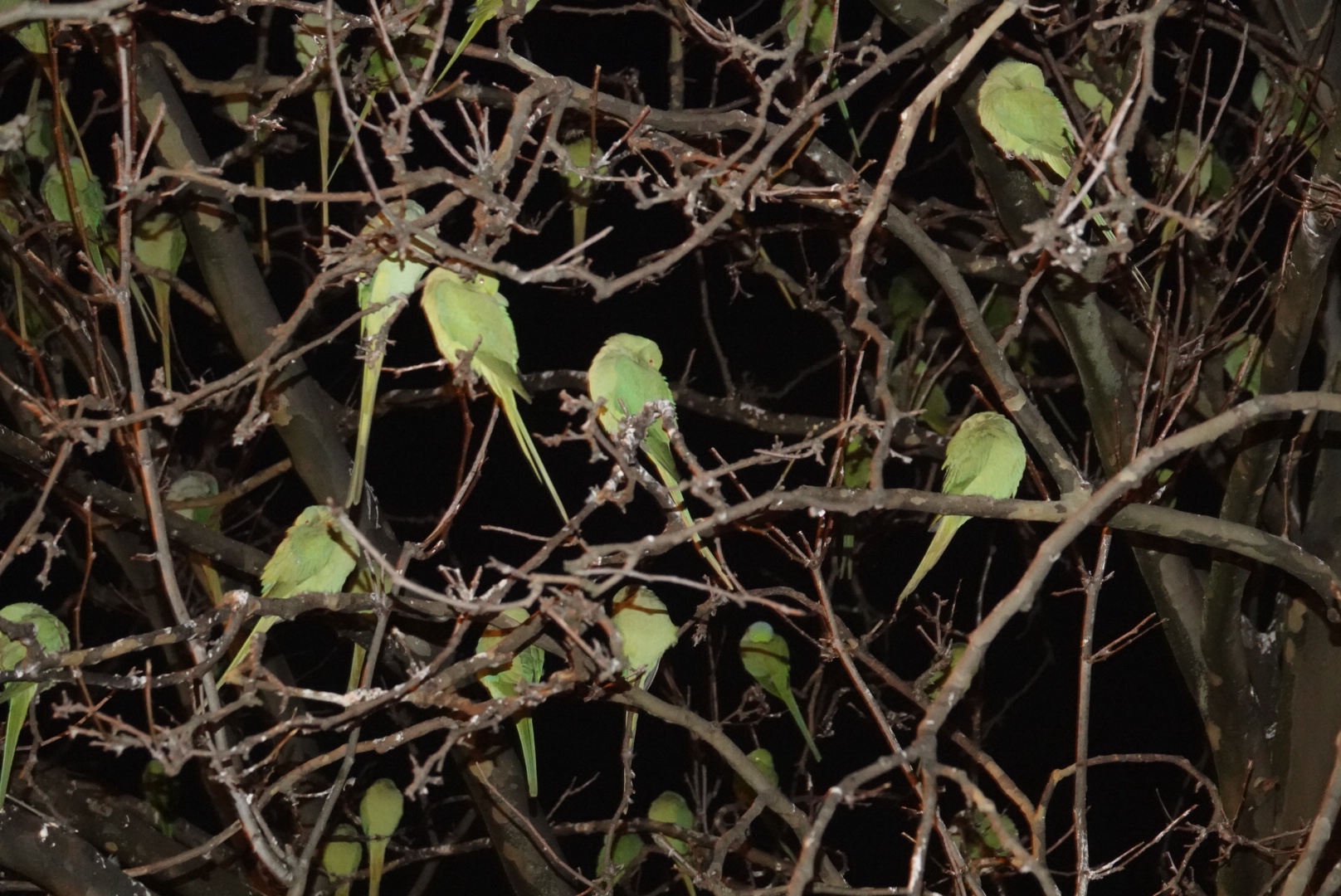 On our walk home, we passed under the trees in the harbour where hundreds of green parakeets roost. The birds are the offspring of pet birds released years ago, and have made a year-round home here. During the day, they fly around the city, but at night they return to the same 4 trees, where they look like live fruits! With some inventive use of his flash, Ted managed to capture a photo of a few of them.
