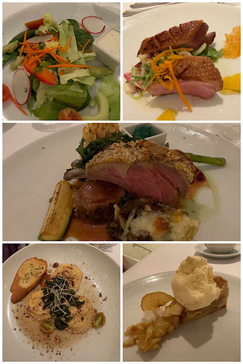 Shipboard dinner #2. Top (appetizers): tossed salad with ranch dressing; cold orange duckling “chaudfroid” with jellied orange chutney. Centre: rack of lamb à l’ambassadeur, served with mushroom-stiffed artichoke, horseradish, mustard, and duchesse potatoes. Bottom: cheese ravioli with porcini brown butter and hazelnuts; Dutch apple pie à la mode.
