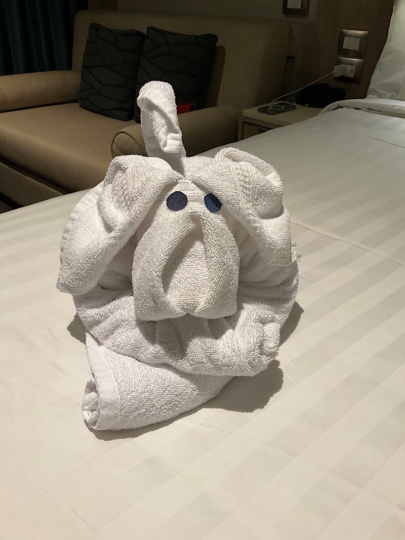 After dinner we listened to live music in Billboard Onboard (dual pianos) and the Rolling Stone Rock Room (5-piece band) before having a late-night snack of chicken wings at the New York Deli and heading to bed, where a towel puppy was waiting for us.
