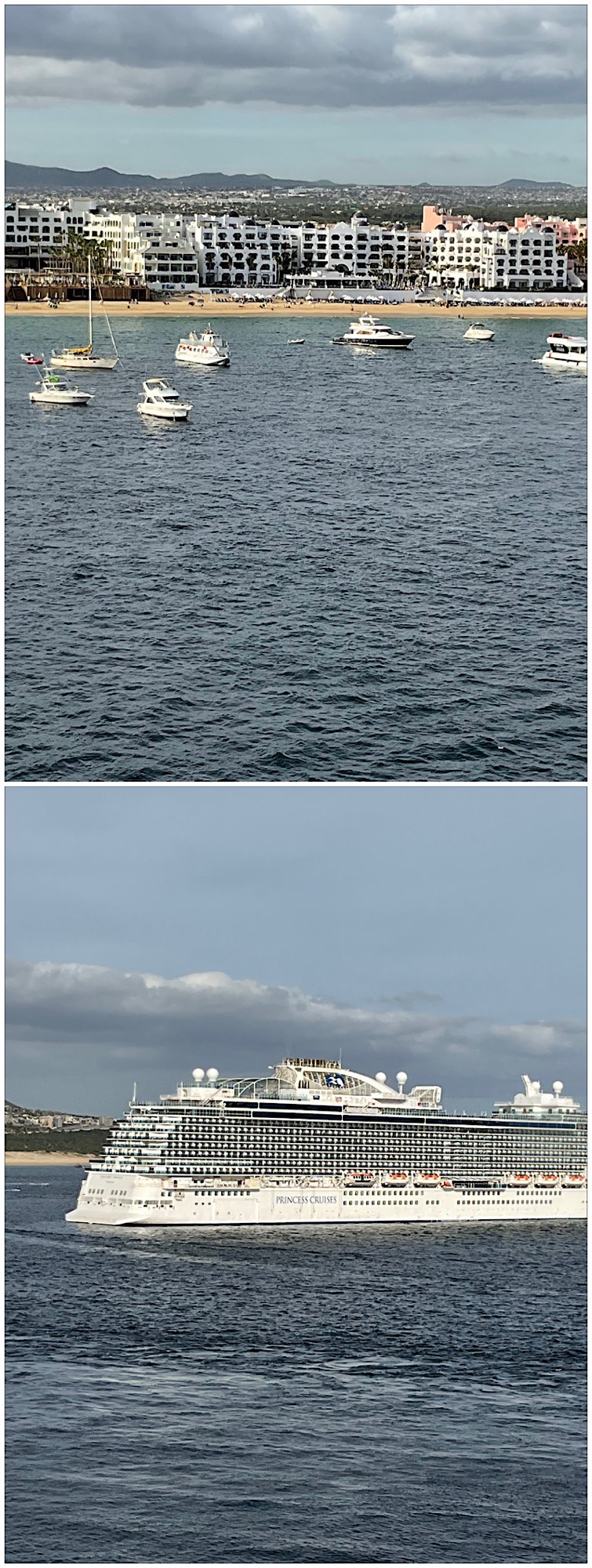 Today marks our first port of call: Cabo San Lucas, where we’ve done excursions and spent time wandering 3 times previously on other cruises. Episode 52 (Dec 2019) , Episode 159 & Episode 167 (Jan 2022) . Cabo is an “anchor” port necessitating a transfer by tender (lifeboat) from the ship to shore.