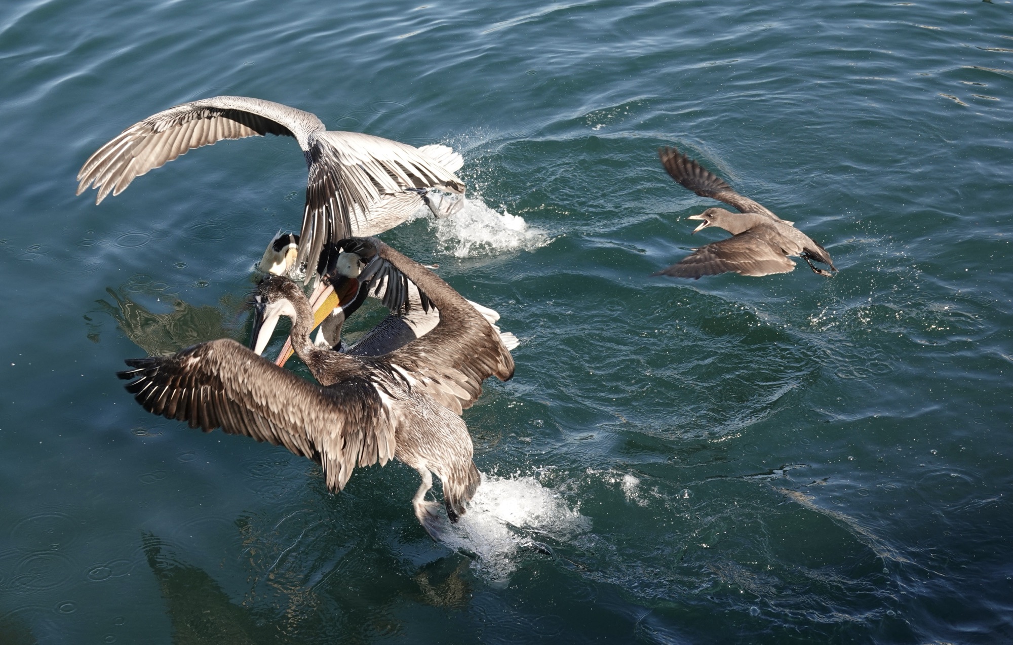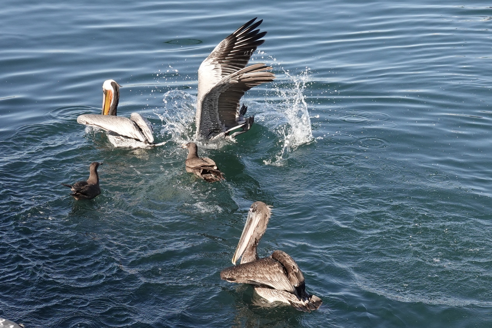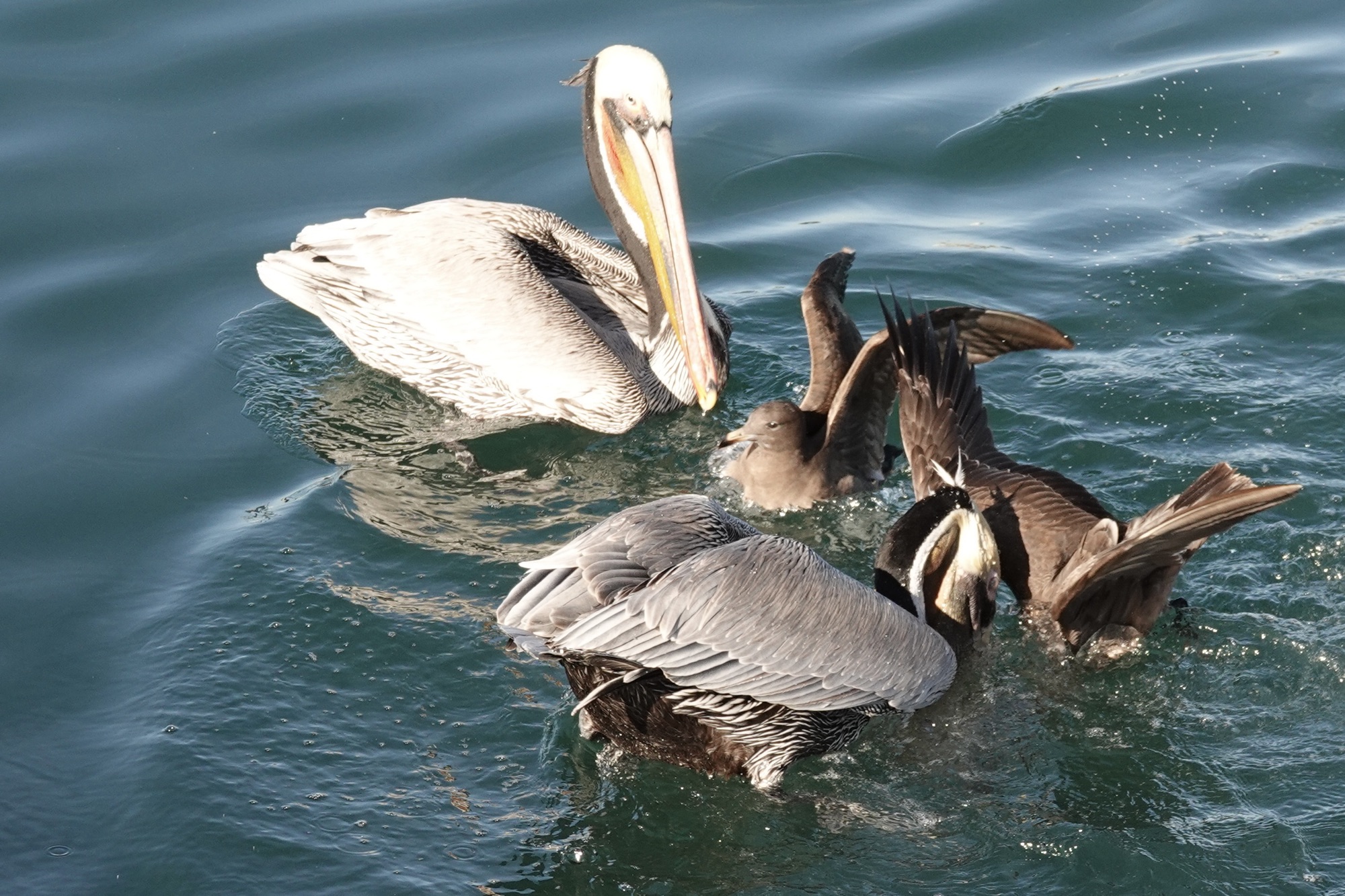 Further along the walkway we came to the Saturday fresh tuna market, where pelicans, cormorants, and shearwaters “fished” beside the pier, and loud, lazy harbour seals dined on scraps from the fish vendors.