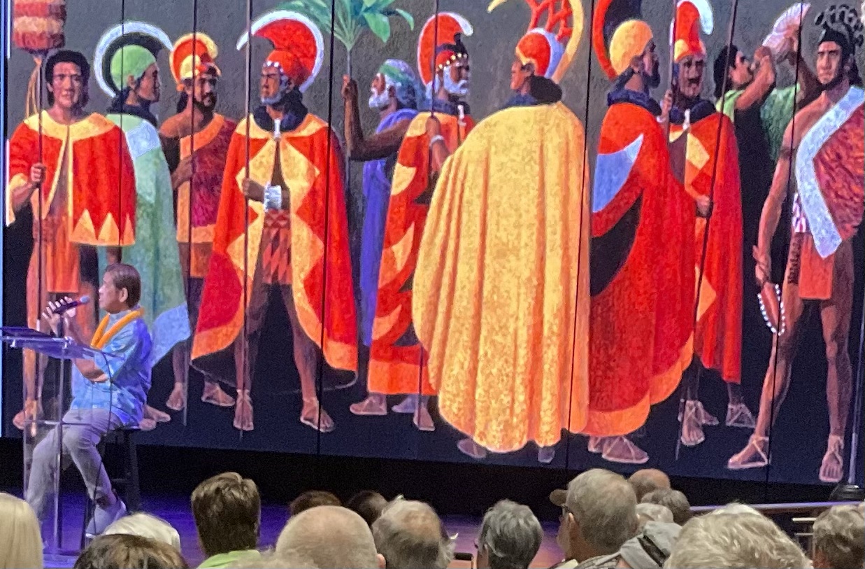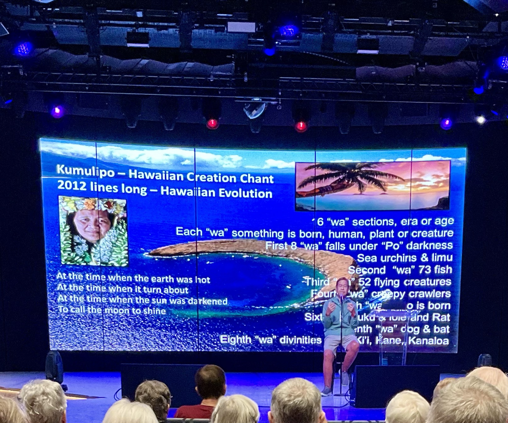 The first talk was a broad overview, touching on geography, culture, immigration patterns, and the huge impact of WWII on Hawaii’s journey to statehood. Less “Jewels of the Pacific” than “An Introduction to Hawaii”. Cruise Director Kristen narrated, and as usual there were filmed interviews with Hawaiian residents from various walks of life.