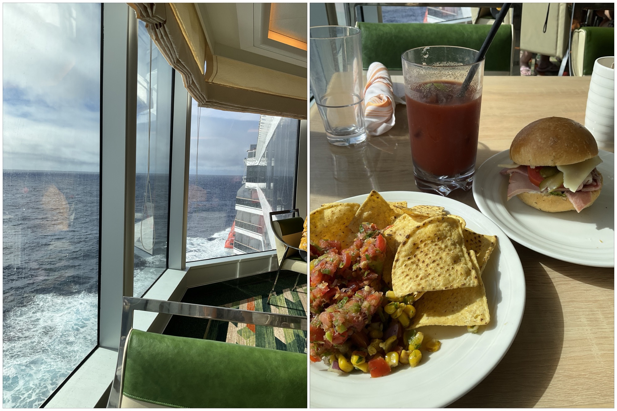 There was smooth sailing and a nice view from the Lido buffet for my lunch of a mortadella and provolone sandwich with a side of tortilla chips (totopos) and salsas, plus tomato juice.