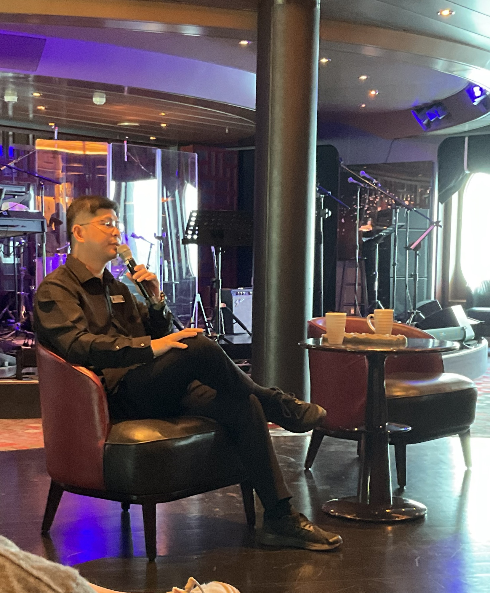 Kristen’s coffee chat guest was Jerald, the ship’s Technical Production Manager. Jerald began his work life as an aircraft maintenance engineer in Manila, Philippines, and changed to a production/lighting career after aircraft industry layoffs. He’s been with HAL since 2006, when he broke through the cultural barrier to become the first Filipino backstage technician. He joked that it was because Filipinos are hard workers and obedient, but quite honestly shared that they are also cheaper, and the work ethic of people from more affluent countries can be “different”, since there are more opportunities available to them. Jerald has a crew of 7, who manage not only the tech needs AND DESIGNS for all the production shows and guest entertainers, but also the video behind lectures and all of the background music on the ship … as well as doing auxiliary jobs like arranging the piano tuner for the instrument used in the World Stage. He said it can be hard to keep up with the pace of change in new technology, and to maintain equipment on a moving ship, but that he has always enjoyed “playing with toys”! There is backup equipment on board, since repairs could take months. Speaking of months, and work ethic, Jerald’s contract is 6 months on board and 2 months off. He told us that American crew members prefer a 4/2 rotation, but Filipinos prefer the longer onboard stretches since it helps them save more money for their families at home. In fact, when Jerald goes home, he still works … as a solar panel installer!