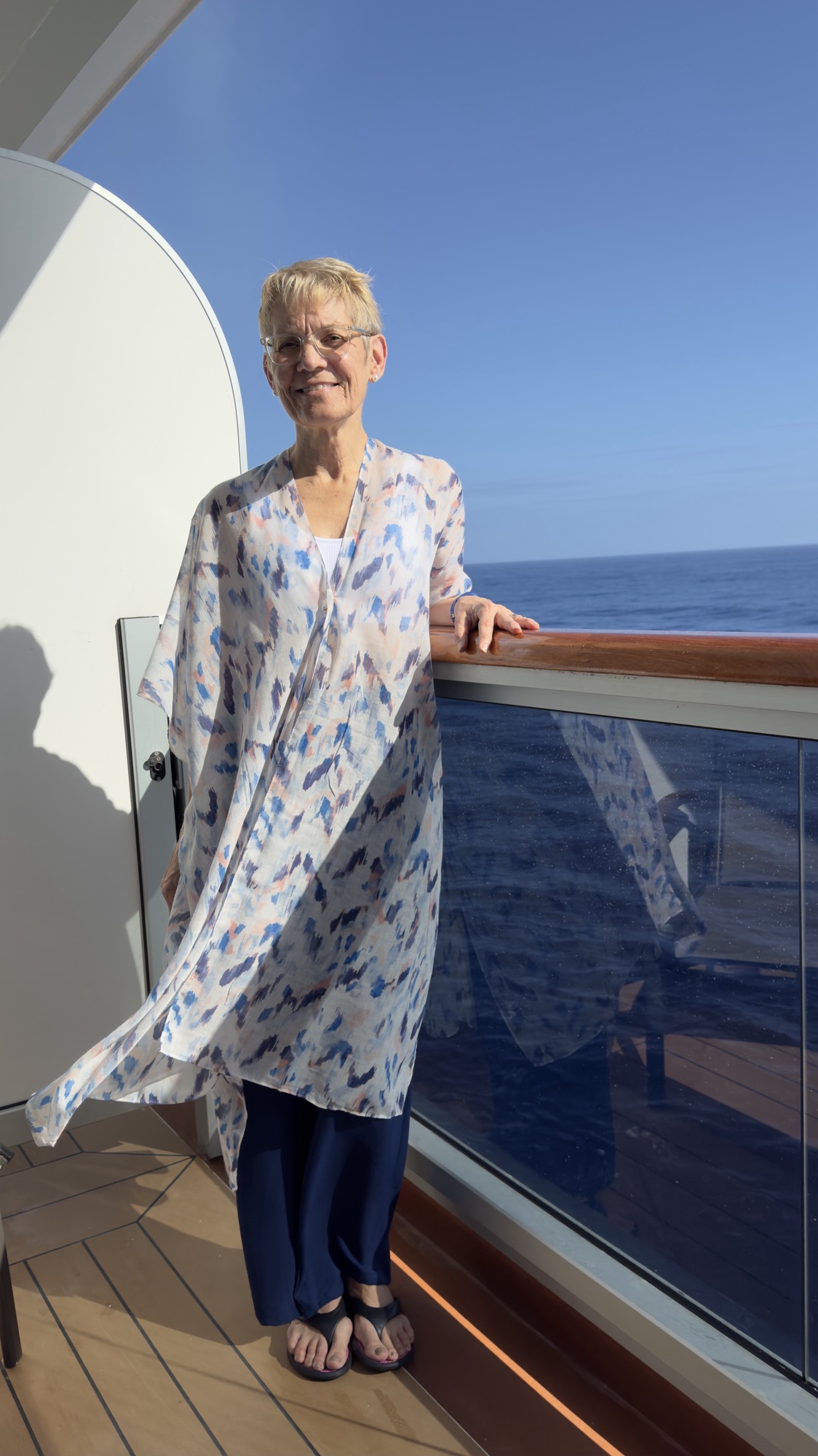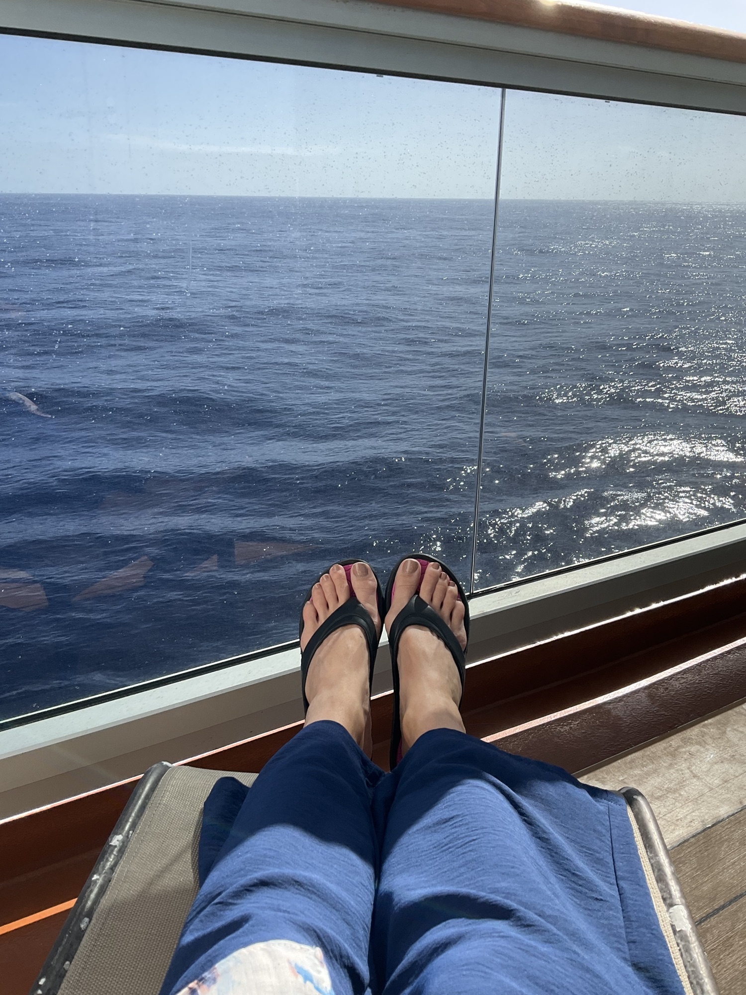 Ted headed up to do his daily laps of the walking track, undeterred by the swaying, but I just settled in on the balcony to finish my book and pose for a happy sun and ocean picture to match Ted’s selfie from the other day.