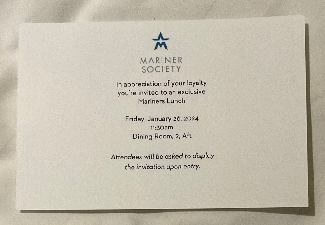 We’d received these invitations earlier in the week. We know what Viking Explorer Society receptions look like (cocktails with the Captain, and live music), but were curious about Holland America’s Mariner Society lunch, so I skipped the 11 a.m. hour-long talk on the history of education in Hawaii so that Ted and I could attend.