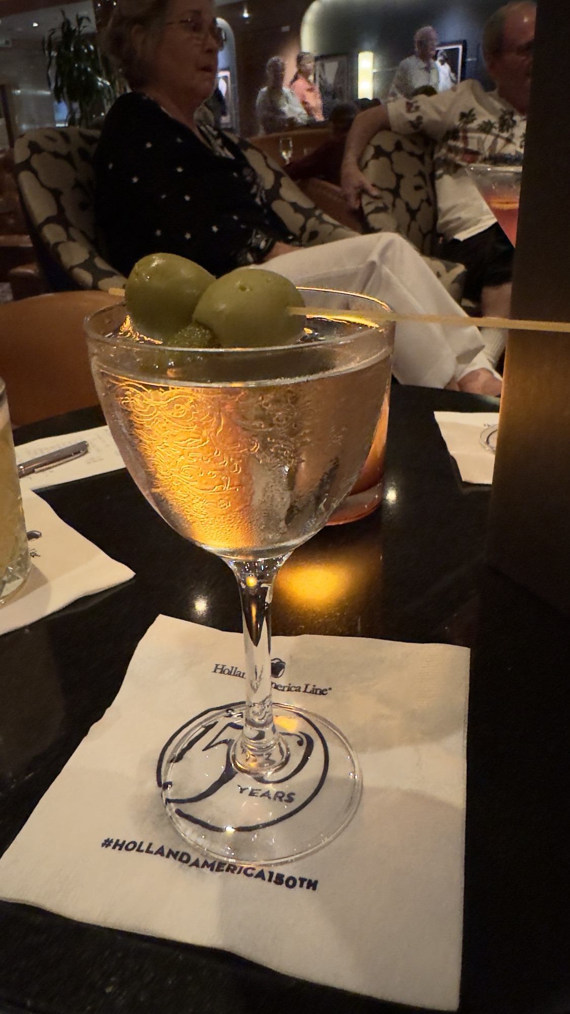 We stopped for drinks and conversation between the show and our 7:30 dinner reservation, and experienced one of the strange things that happen far too often on this ship: my martini served in a port wine glass, and with pickles stuffed into the olives. Just weird.