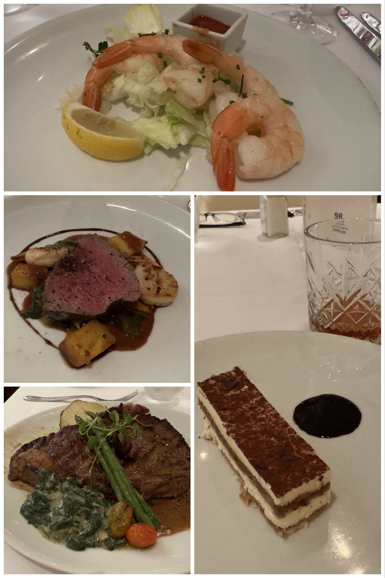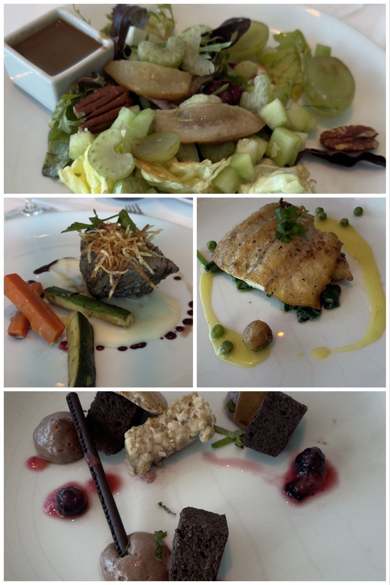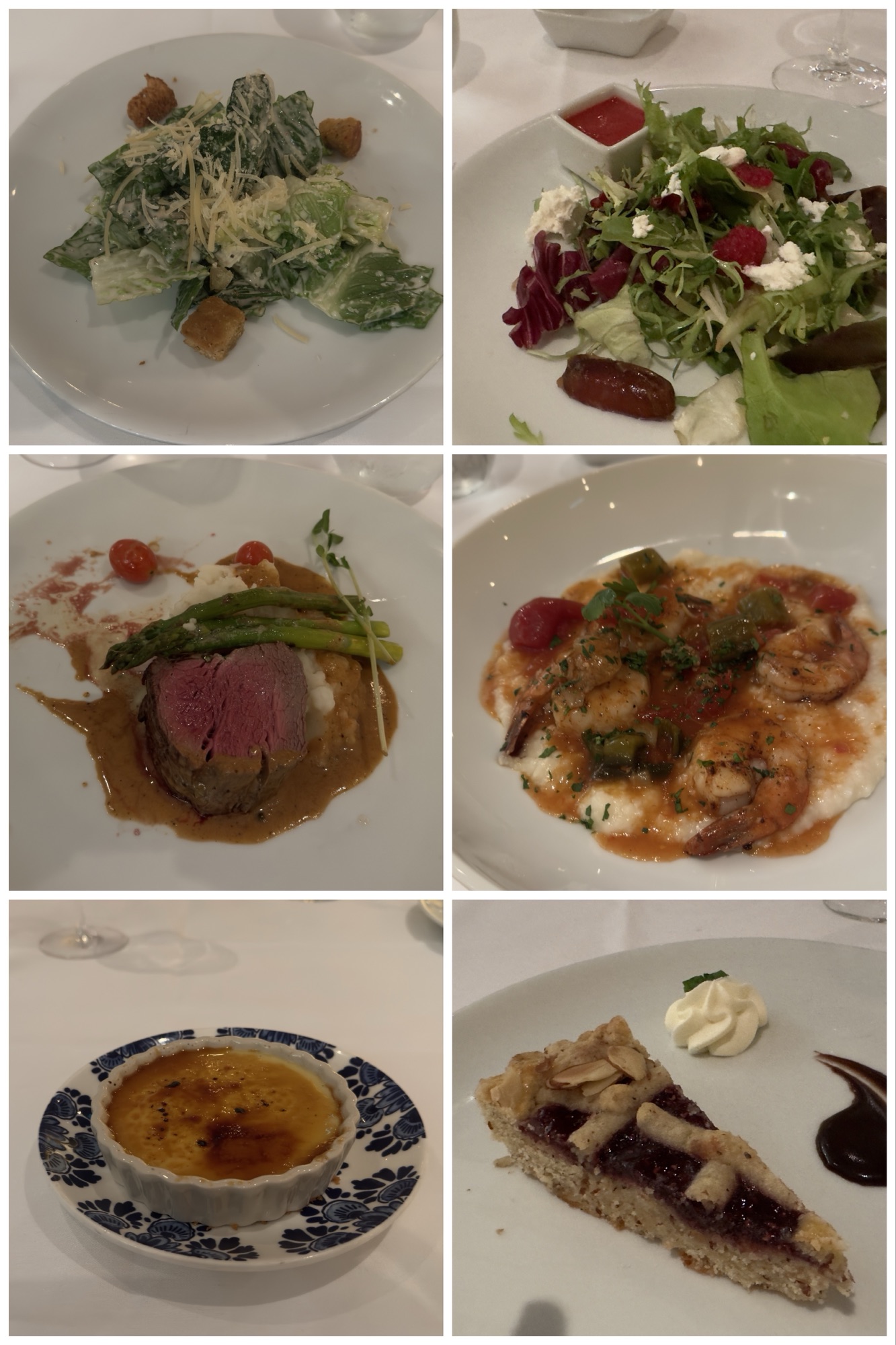 Right top to bottom: my dinner. Excellent date, raspberry and goat cheese salad; meh shrimp, grits, and andouille sausage; delicious linzer torte.