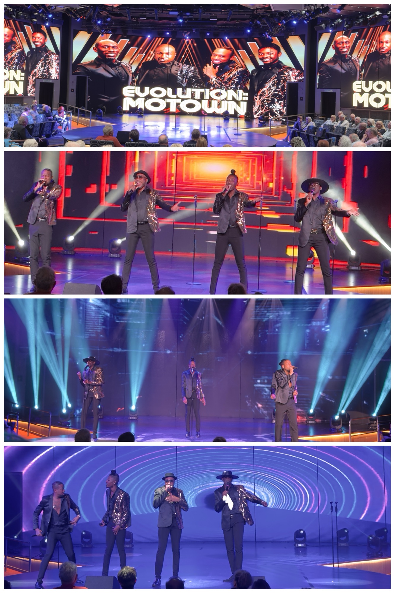 Then off to change for “dressy night” dinner, and collect Ted to take in the 6 p.m. performance by the absolutely excellent vocal group Evolution Motown on the World Stage before our 7:30 dinner seating.