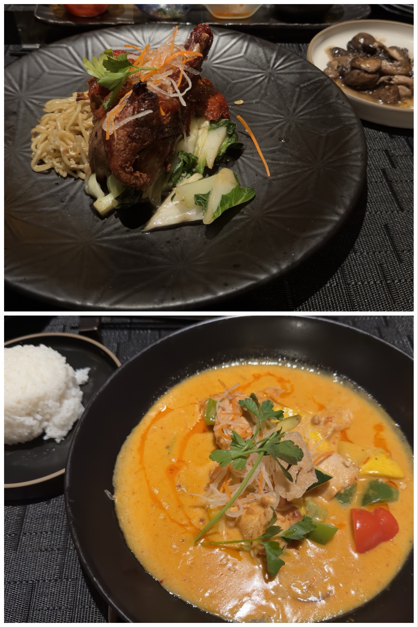 As his main course, Ted had crispy duck in a ginger-chili glaze, served with drunken udon noodles and a side of sake-braised oyster and shiitake mushrooms. I had spicy Panang red curry coconut chicken with jasmine rice.