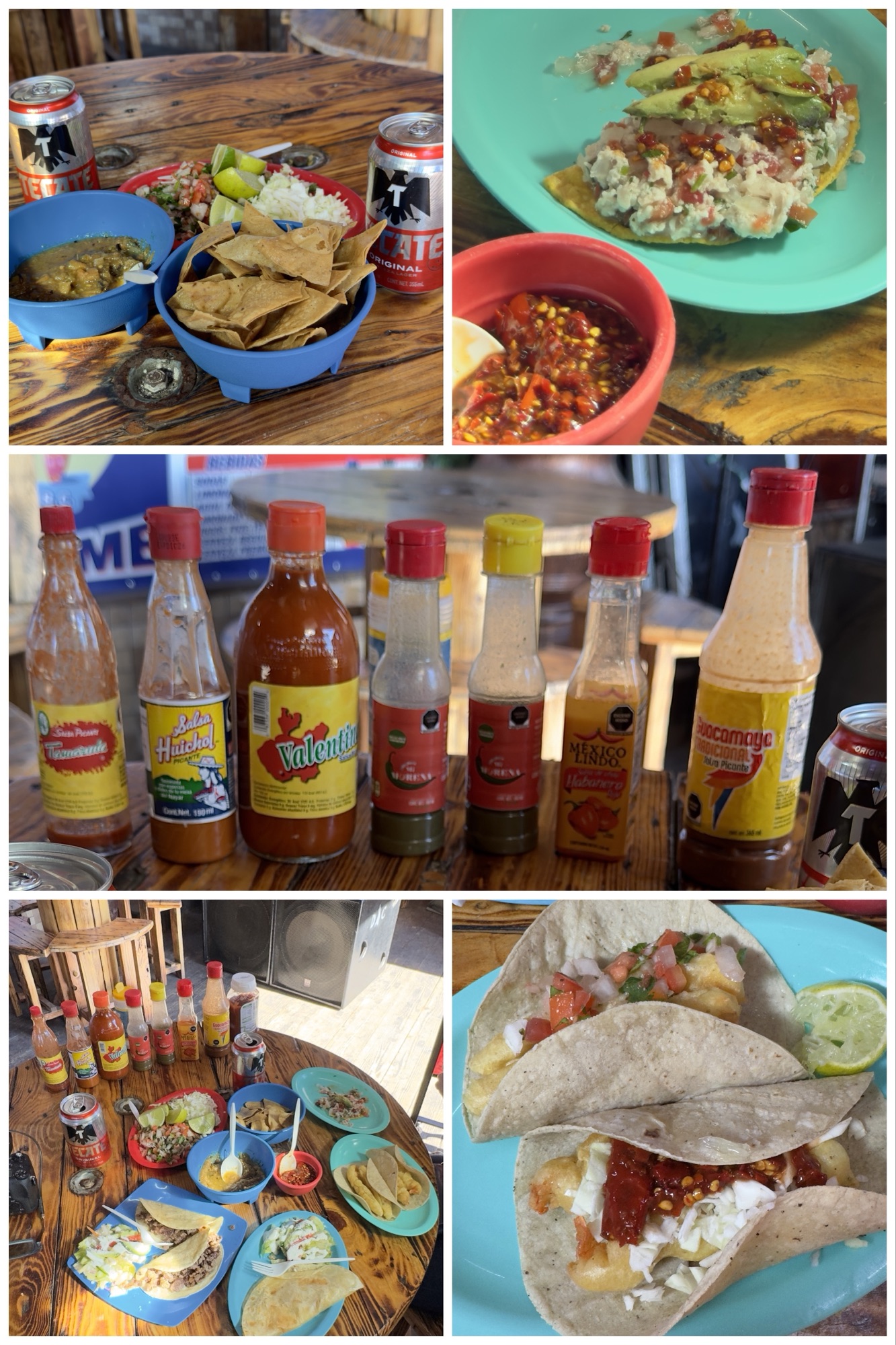Ensenada is famous for their seafood, and their fish tacos, neither of which Ted can eat – but I can! We started with beers, which arrived with totopos and salsa verde to snack on. The owner, Beto, suggested asada tacos (spiced meat) on corn tortillas for Ted, to which we added a quesapollo (cheese and chicken) on a flour tortilla. I ordered a fish tostada and 2 shrimp tacos – with extra spicy salsa. Beto was skeptical, but agreed to bring me his home-made habanero paste “on the side”, after also bringing us a huge assortment of sauces, arranged on the table from mildest to spiciest. His concoction was seriously HOT – and also extremely delicious! Beto seemed shocked that we finished almost all of it, until we told him about living in Mérida last winter. It turned out that he was a Yucateco himself, and pronounced that “of course” we could handle the heat in that case!