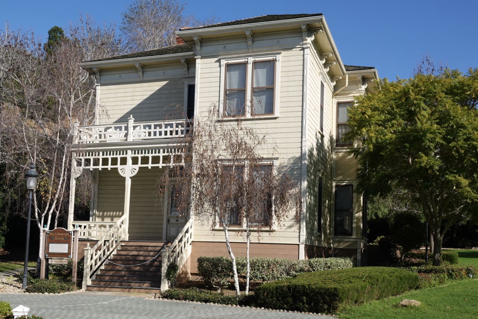 McConaughy House was built in 1887 by John MConaughy, a rancher from Northern California who founded the first scheduled passenger and freight service in San Diego County: 4-horse passenger stages and 6-horse wagons, respectively. What makes the house architecturally interesting are its decorative Eastlake brackets, the low pitch of its roof, and the bay window (off to the right, hidden by the tree).