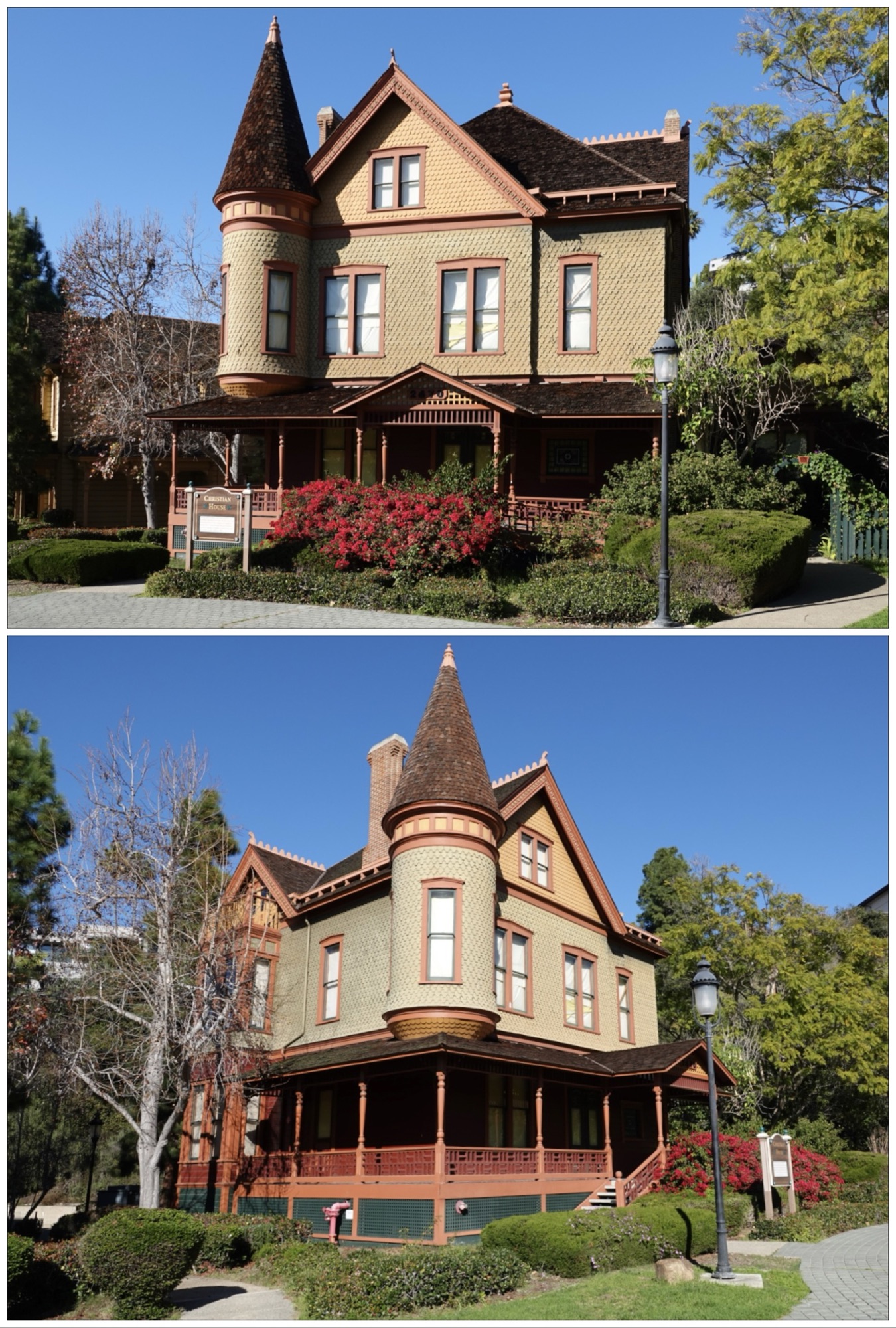 Christian House, in Queen Anne late Victorian era style, has all the embellishments: turret, chimneys, shingles, wraparound porches, and lots of decorative cutwork. Its owner, Harfield Timberlake Christian was founder and president of the San Diego Title Insurance Guarantee and Trust Company (a name almost as impressive as his own!) and a commissioner for the 1915 Panama-California Exhibition (which was responsible for all the gorgeous buildings still standing in Balboa Park).
