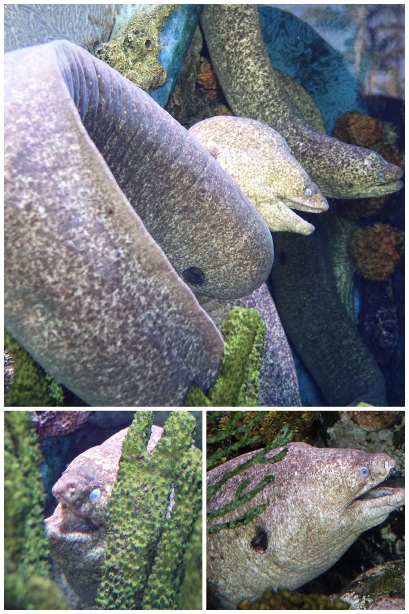 At the entrance to the exhibit is an open tank housing fairly small bamboo sharks who just seem to be sleeping on the bottom. Andrew, the marine biologist on duty, explained that the idea that sharks need to swim constantly in order to breathe is somewhat of a myth. Apparently only a very few of the oldest species – like great whites – need to stay in motion in order for oxygenated water to pass over their gills. Many sharks, like the bamboos, have spiracles: round sphincter-like vestigial gills through which they can “inhale” water. The spiracles are located high on the sides of their bodies, so they can rest on the sandy ocean floor and not ingest sand. Andrew reminded us that eels and rays also have spiracles instead of gills.
