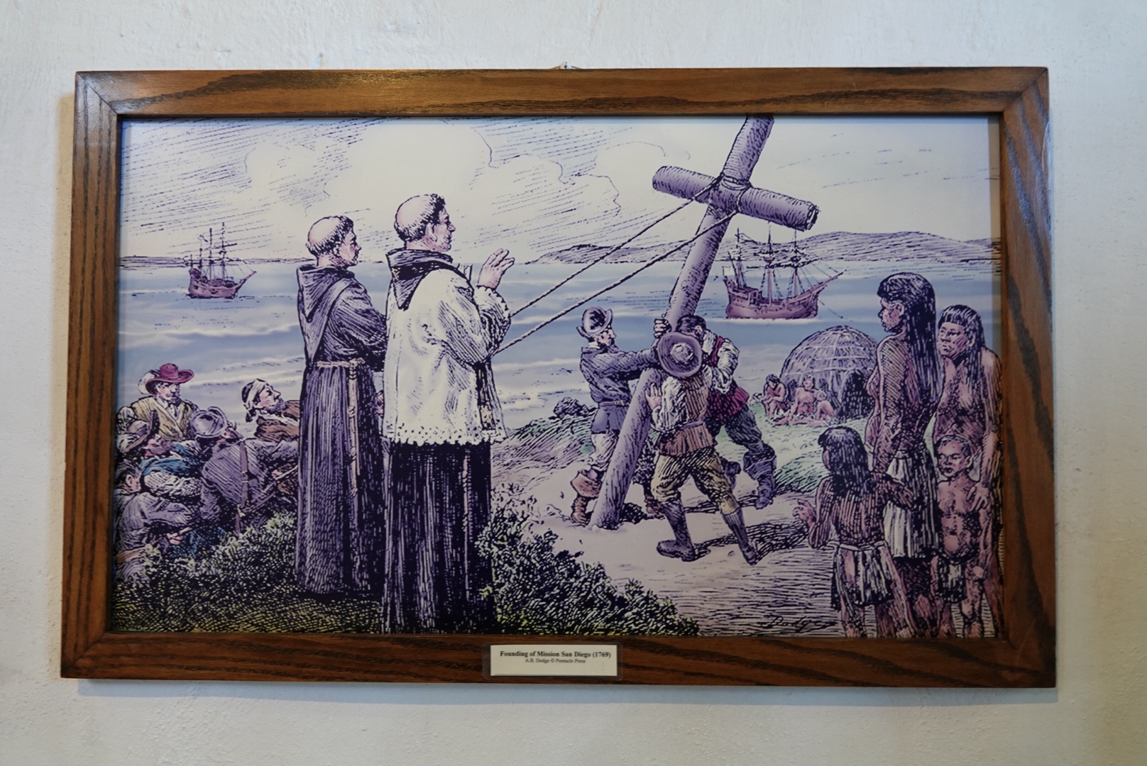 In 1775, the mission was destroyed by an Indian attack. There is a large white cross beside the church that marks the spot where Padre Luis Jayme became the first Catholic martyr of Alta California. Whether the Indians were intent simply on pillaging the mission, or on destruction, and whether he was “brutally murdered while uttering the cry “Love God, my children”” as is inscribed on the monument, or died accidentally in the blaze that consumed the wooden pole and dried reed mission, may be a matter of perspective. The usual expression is that history is written by the victors, but in the case of 1775, history was written – literally – by those capable of writing.