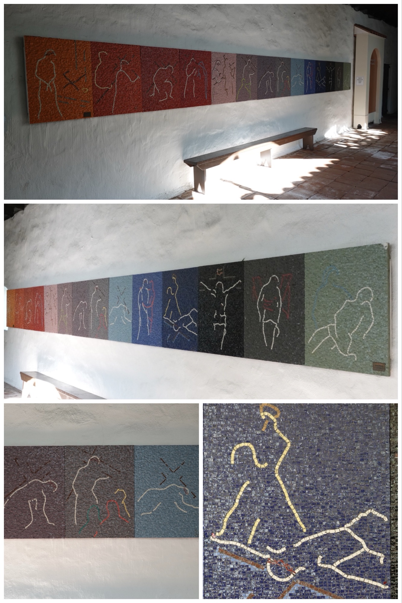 From the garden we walked through a passageway leading to the small mission museum. In addition to the expected traditional statuary, the wall is decorated with a quite beautiful but very modern mosaic depiction of the Stations of the Cross.