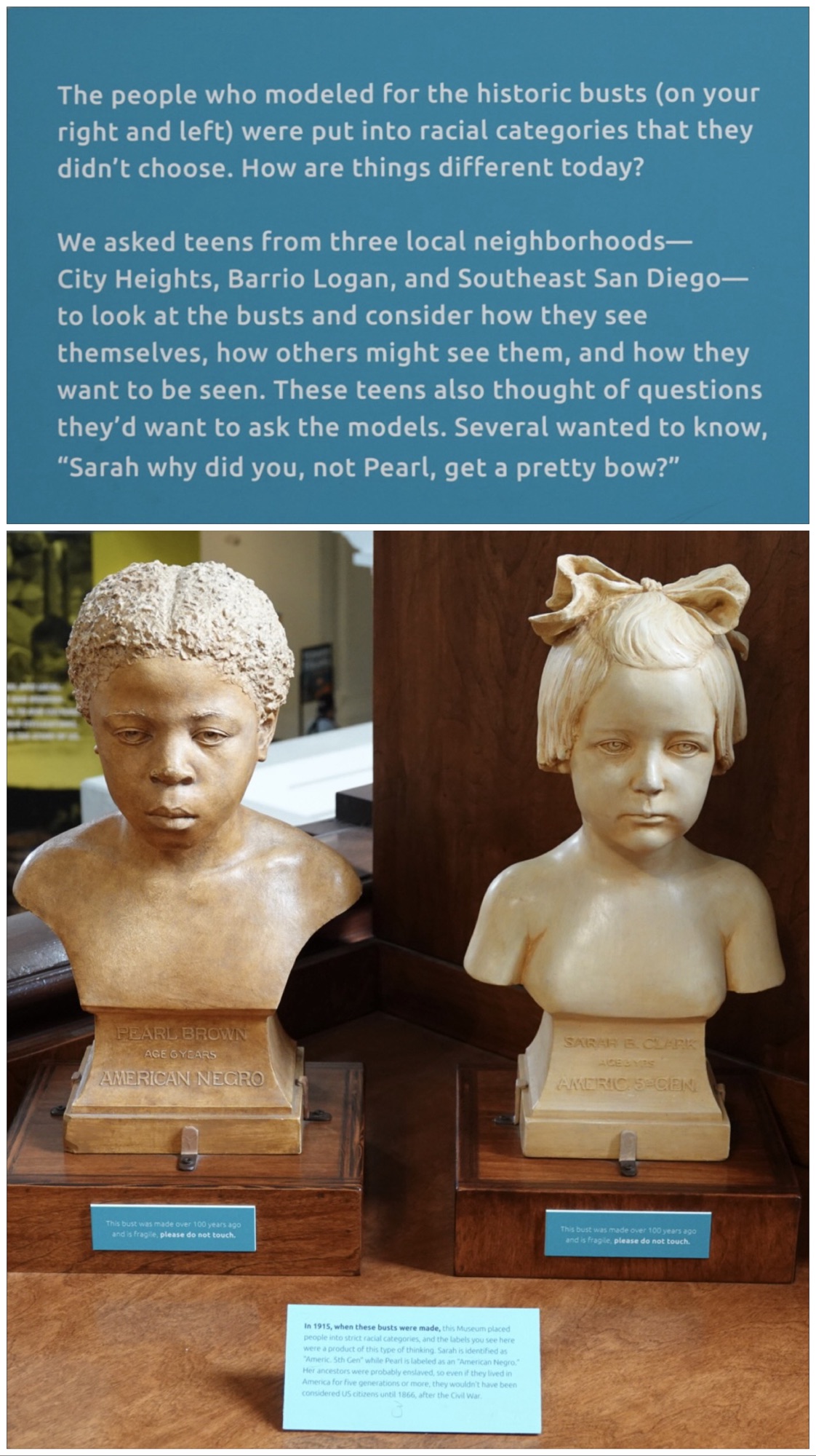 The blue placard in front reads: “In 1915, when these busts were made, this Museum placed people into strict racial categories, and the labels you see here were a product of this type of thinking. Sarah is identified as “American. 5th Gen” while Pearl is labeled as an “American Negro.” Her ancestors were probably enslaved, so even if they lived in America for five generations or more, they wouldn’t have been considered US citizens until 1866, after the Civil War.”