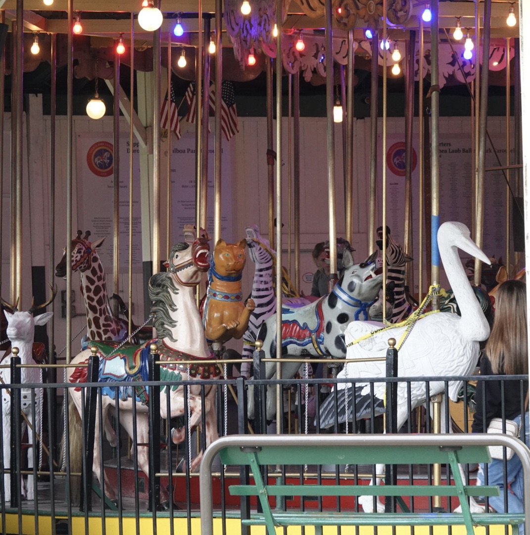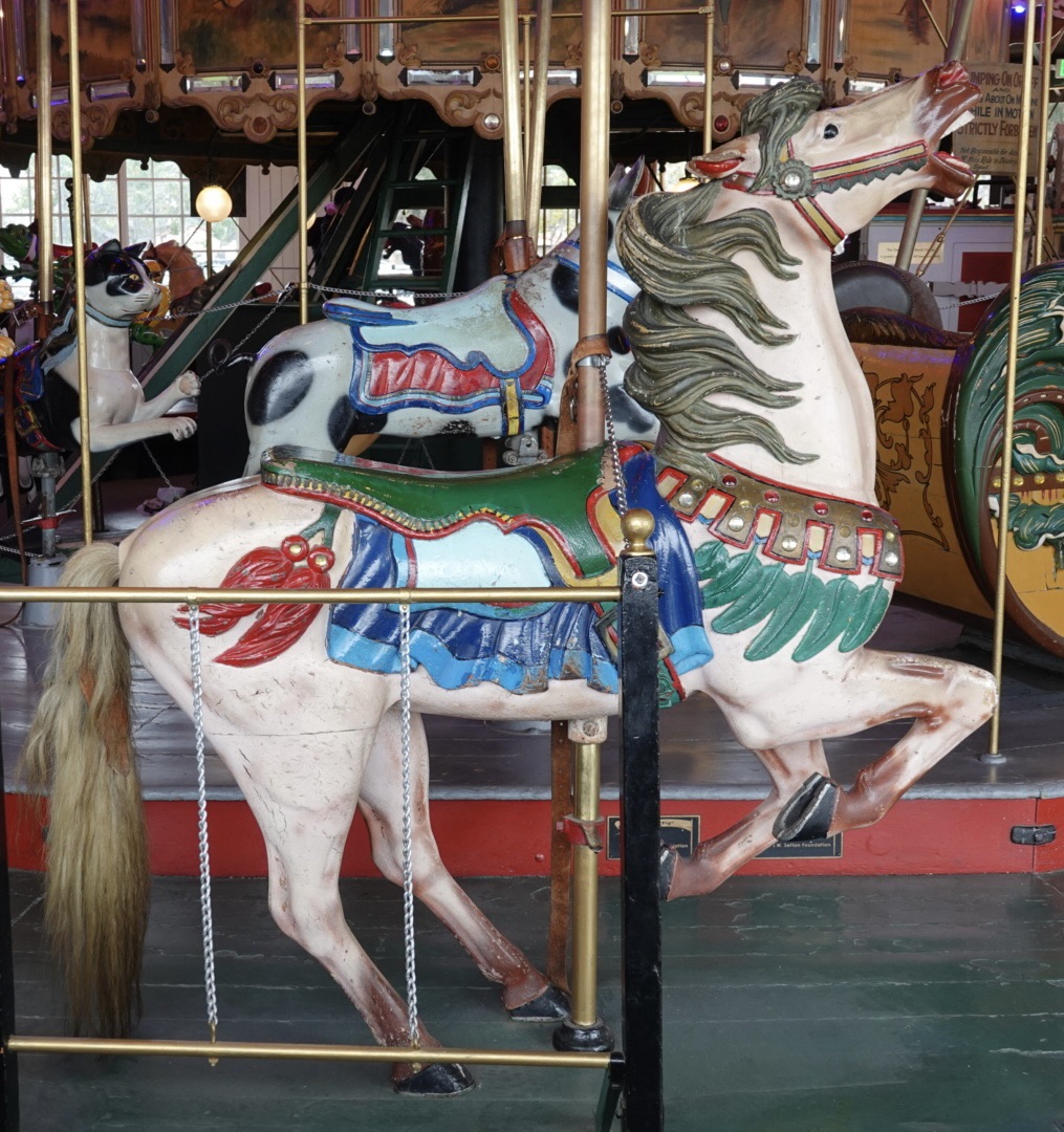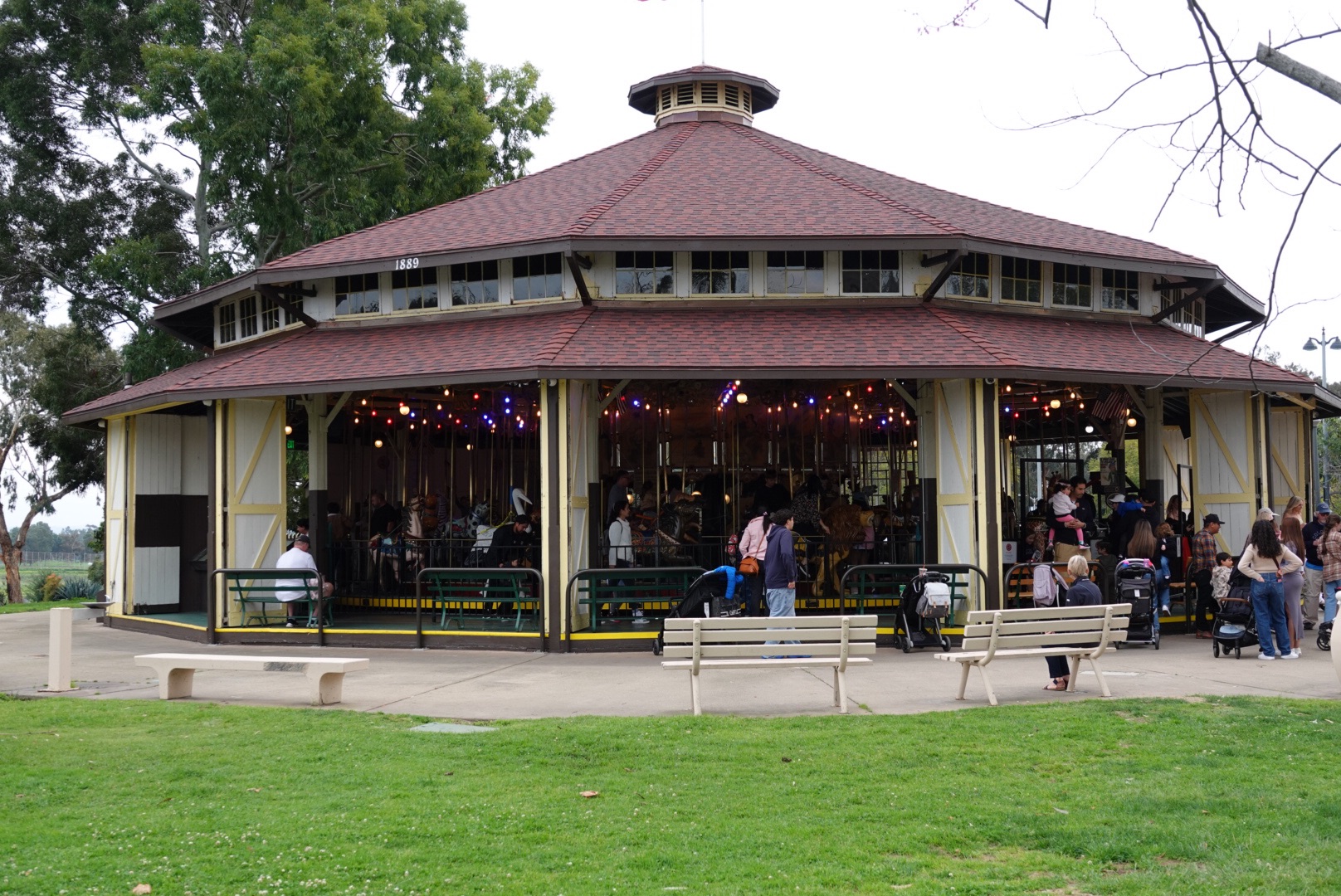 After leaving the museum, we made two brief stops still within Balboa Park: one for ice cream, and one to see the famous menagerie carousel. Built in Tonawanda New York in 1910, it was first shipped to Los Angeles and then moved in 1915 to Hotel Del Coronado’s summer resort, Tent City. The Carousel was brought to Balboa Park in 1922. All the carousel’s animals are original except four miniature horses that were added in the 1970s. Also original are the hand-painted murals surrounding the upper portion of the carousel and the military band organ.
