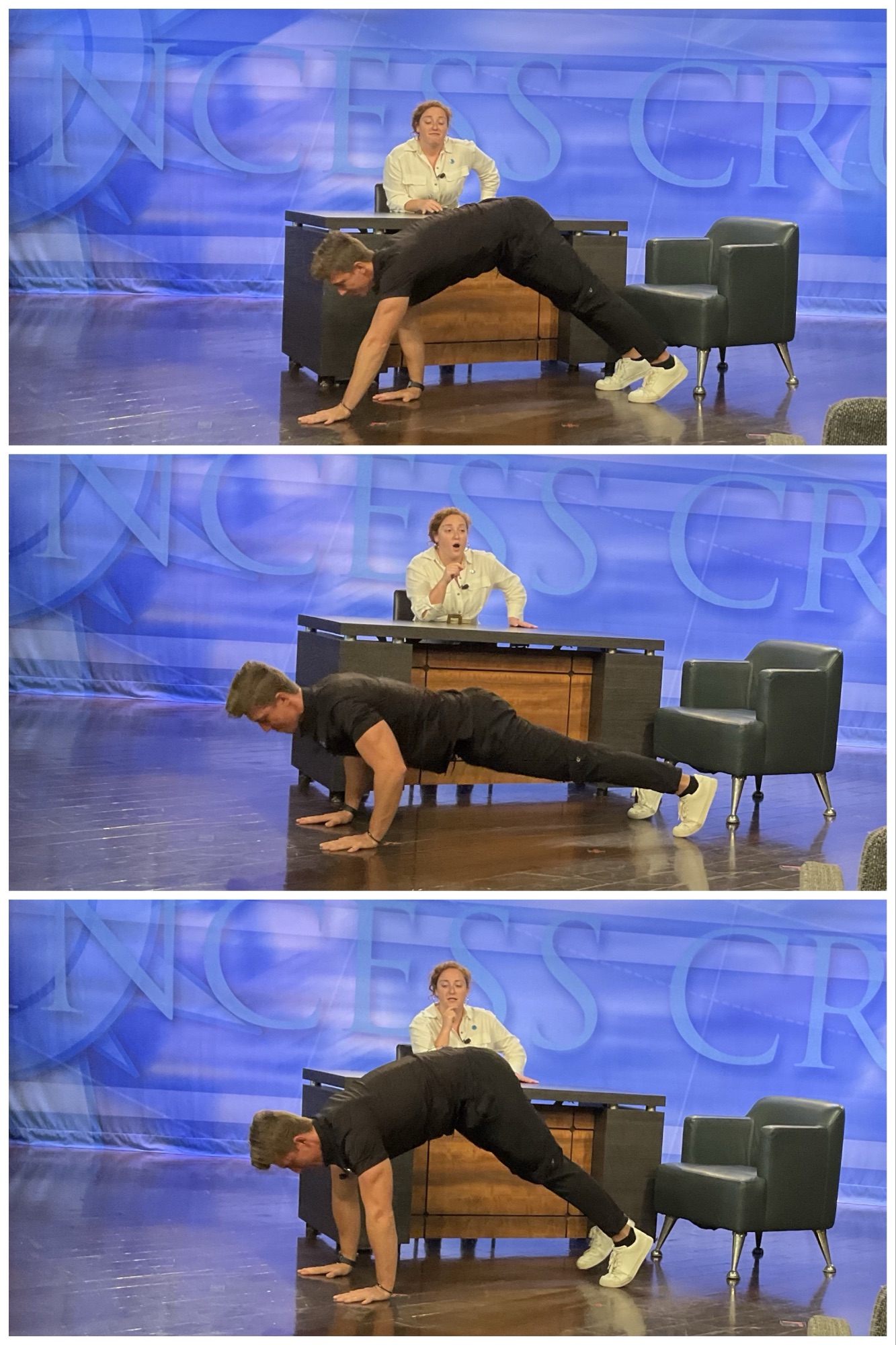 After those great guests, it was time for the “main event”: the portion of the show that normally comes first. she was joined by Assistant Cruise Directors Matt and Jed, who prior to filming painstakingly stacked Jenga tiles on the anchor desk.