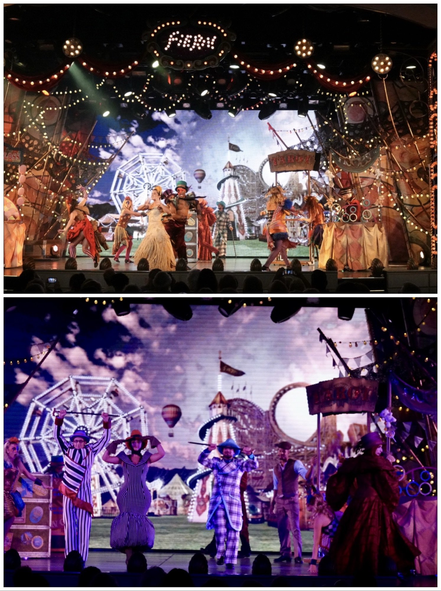 Then it was time for the second big production show of the cruise, Fiera, the Italian word for a fair/carnival. It was incredible staging for a mid-size cruise ship – a cross between Cirque du Soleil and Baz Luhrmann’s Moulin Rouge. The costumes and effects, including a tilt-a-whirl, carousel, and roller coaster wowed us. Combine that with a love story, carnival games, a beautiful baby contest, a sideshow, and terrific singers and dancers and the show deserved the adjective “spectacular”.