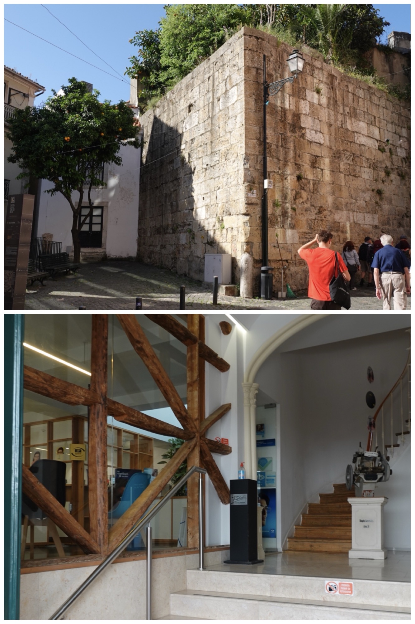 Our guide pointed out stone city walls that long pre-date the devastating 1755 earthquake (top photo below) and also pointed out “earthquake proof” construction in more modern buildings: that decidedly fragile looking wooden reinforcement (bottom left below).