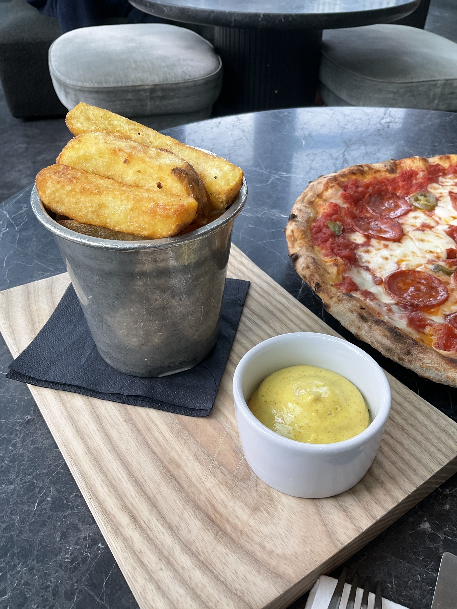 Despite our big breakfast, after all our walking in the “crisp” air, I was hungry again by around 5:00. We’d returned to our hotel for coffees, so decided simply to stay in their ground floor resto/bar space for a hot snack. The kitchen is known for their pizza, so we ordered one garnished with jalapeños and, because the triple-cooked chips in England are just so delicious, I “needed” some of those as well, with curry mayonnaise. Sadly, the pizza was disappointing, but the chips rocked!