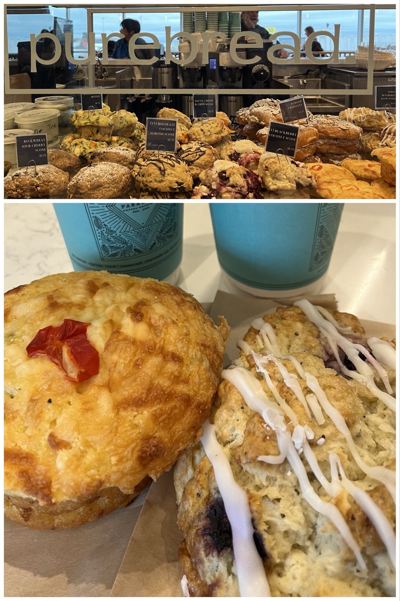 Just look at all the hood stuff in Ted’s cheddar cornbread muffin and my blueberry lemon lavender scone!