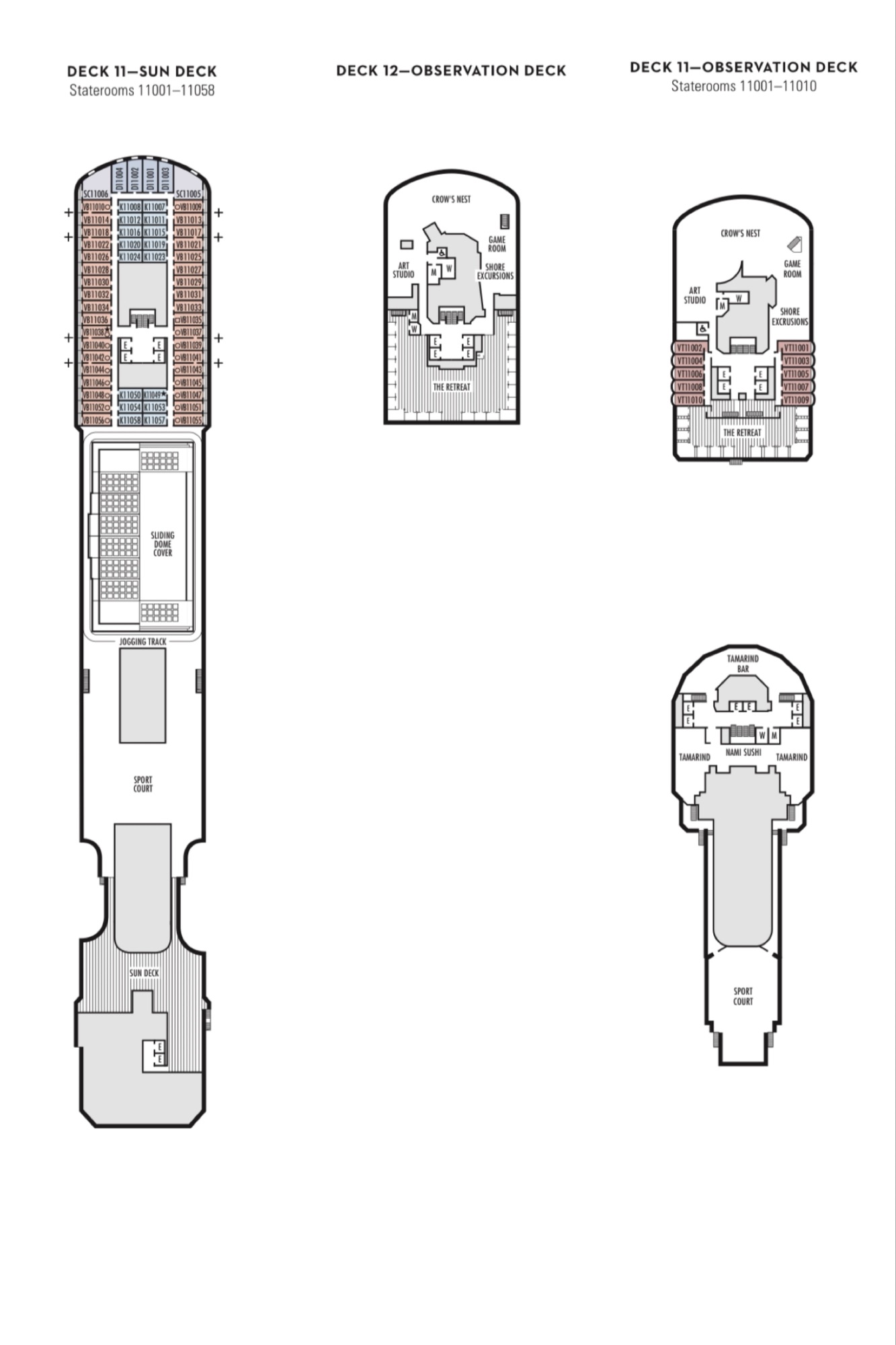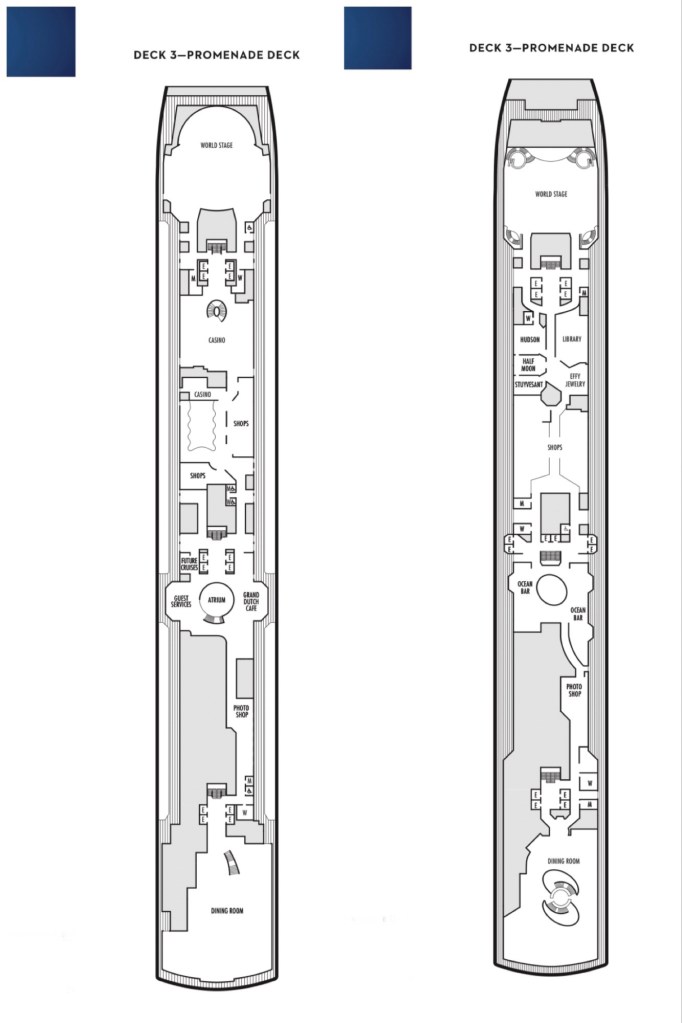 I looked at Holland America’s official deck plans to highlight what we’d potentially notice as the biggest differences between the two ships, not bothering with the stateroom decks, where the only real difference is the larger number of staterooms on the Koningsdam.